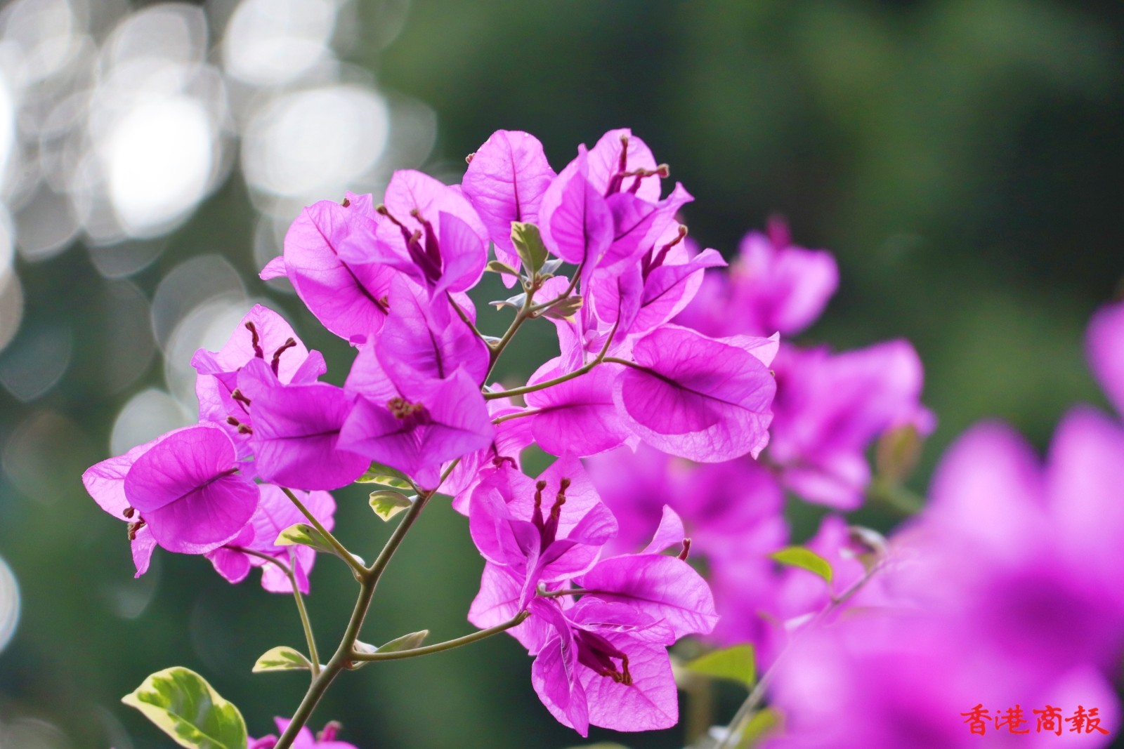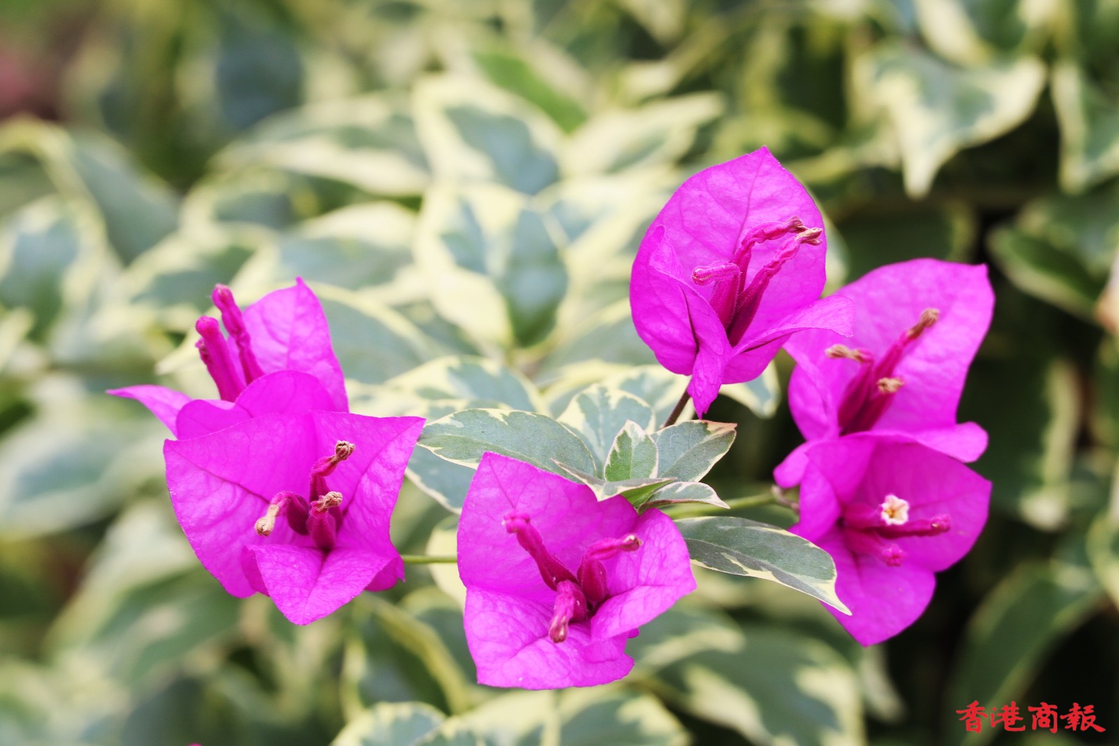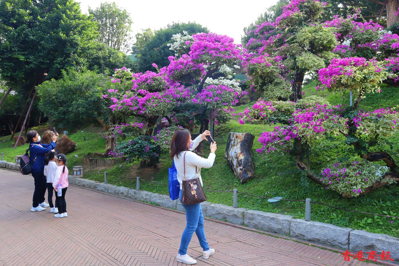南蓮園池的簕杜鵑則種在行人路旁,有鮮紅色、粉紅色、白色,與園內的綠色植形成強烈對比,萬綠叢中一點紅,美不勝收,結合亭台樓閣構成絕色美景。(馮瀚文 攝)