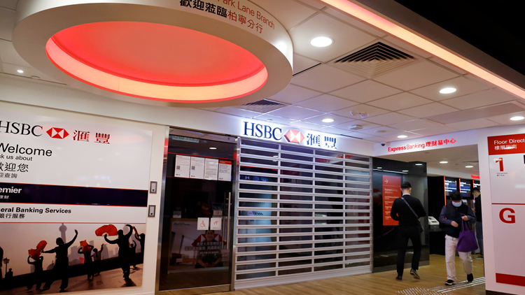 頂圖:滙豐宣布,銅鑼灣滙豐柏寧分行及卓越理財中心因有員工確診新冠病毒,暫停服務。中通社