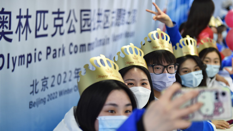 頂圖:2月15日,在北京奧林匹克公園公共區志願者之家,志願者們在慶祝生日活動上合影。