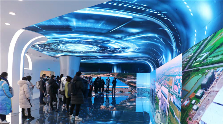最後一站,記者來到了京東集團的總部。在訪客接待中心,站在環繞式全景影像顯示大廳中,伴隨着屏幕的光影變化,京東集團的發展歷程、發展成果從環繞式大屏中撲面而來,仿佛置身於科幻片裏的未來世界。