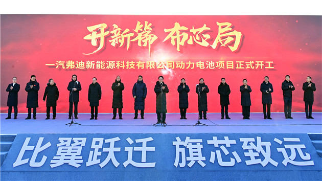 頂圖:日前,一汽弗迪新能源科技有限公司動力電池項目在長春正式開工。吉林省委書記景俊海(中)宣布項目開工,省委副書記、省長韓俊(右六)致辭。鄒乃碩 攝