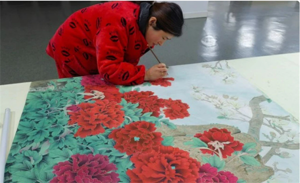 程月菊是一名下崗女工,10年前來到巨野縣書畫院學習工筆畫,零基礎的她經過兩個月的培訓,就可獨自完成一幅作品。「如今熟練了,一幅六尺的畫,基本一周就能畫完。」程月菊說,畫師不必為銷路發愁,畫作由縣書畫院向全國各大畫廊、畫店等平台推薦,收入很穩定。