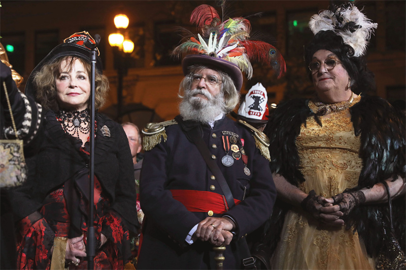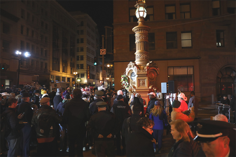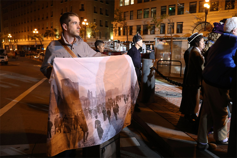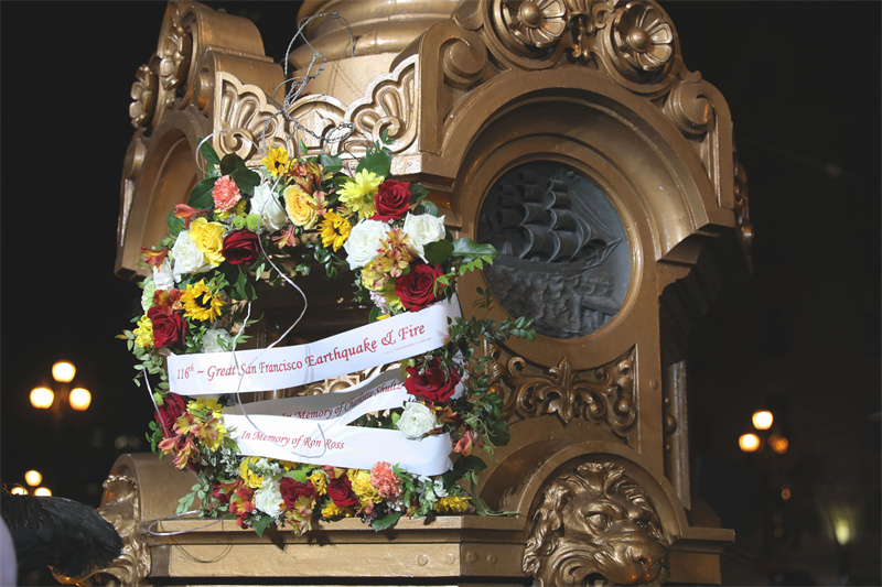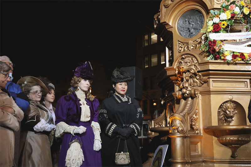當地時間4月18日,在美國三藩市洛塔噴泉旁,人們參加1906年三藩市大地震116周年紀念活動。