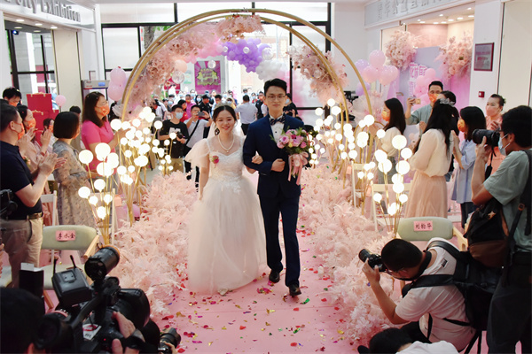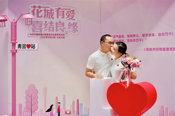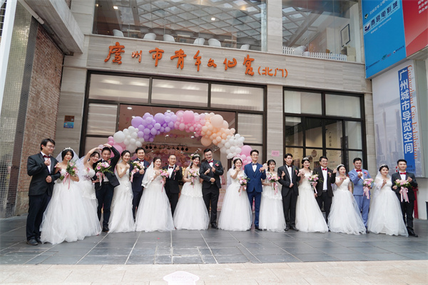 青年集體婚禮、廣府婚俗文化課、愛情照片牆……,5月20日,10對新人參加了在廣州市青年文化宮舉行的「花城有愛·喜結良緣」廣州青年集體婚禮,以求婚獻花、宣誓、交換戒指、擁吻等婚禮儀式,接受由嘉賓頒發的集體婚禮紀念證書,並甜蜜分享了關於他們的愛情故事。