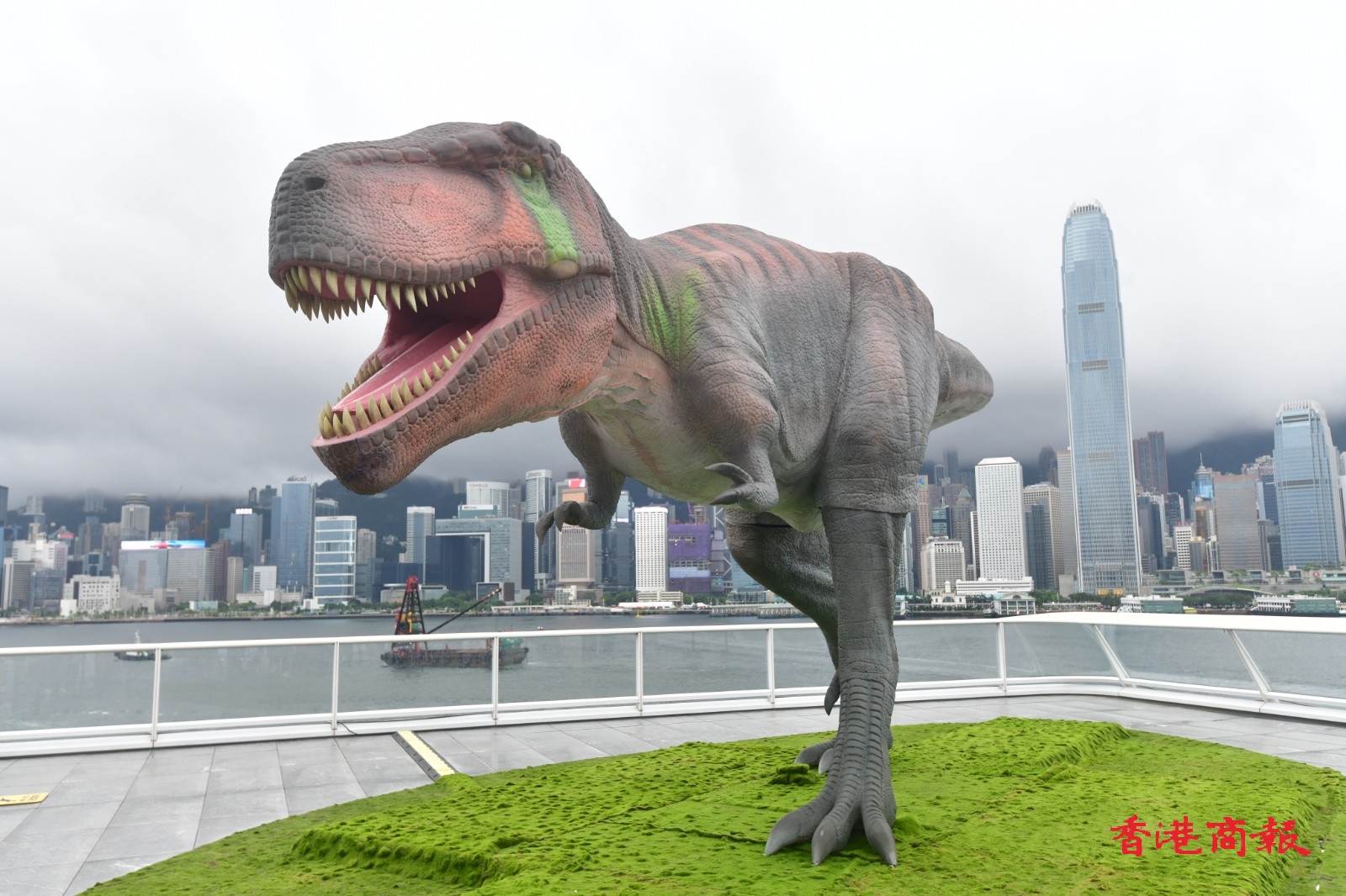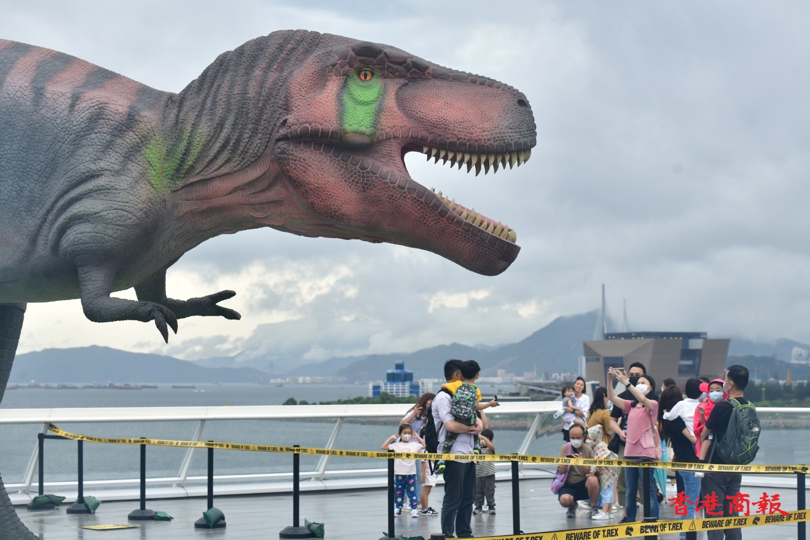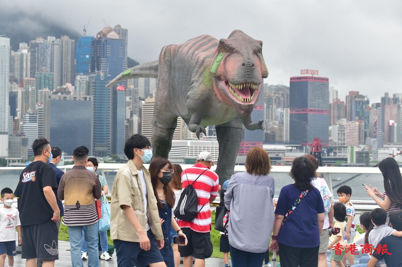 即使連日雨勢較大,兩隻恐龍也不減磅薄氣勢。在海港城及維港背景下,更讓人倍感震撼。有市民在繁喧鬧市的恐龍前打卡時,模彷恐龍狂奔避走,亦相映成趣。(記者 攝影 崔俊良)
