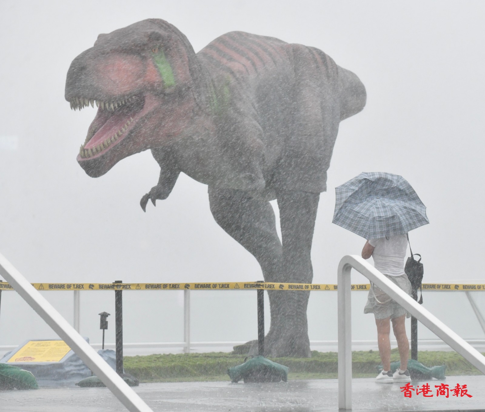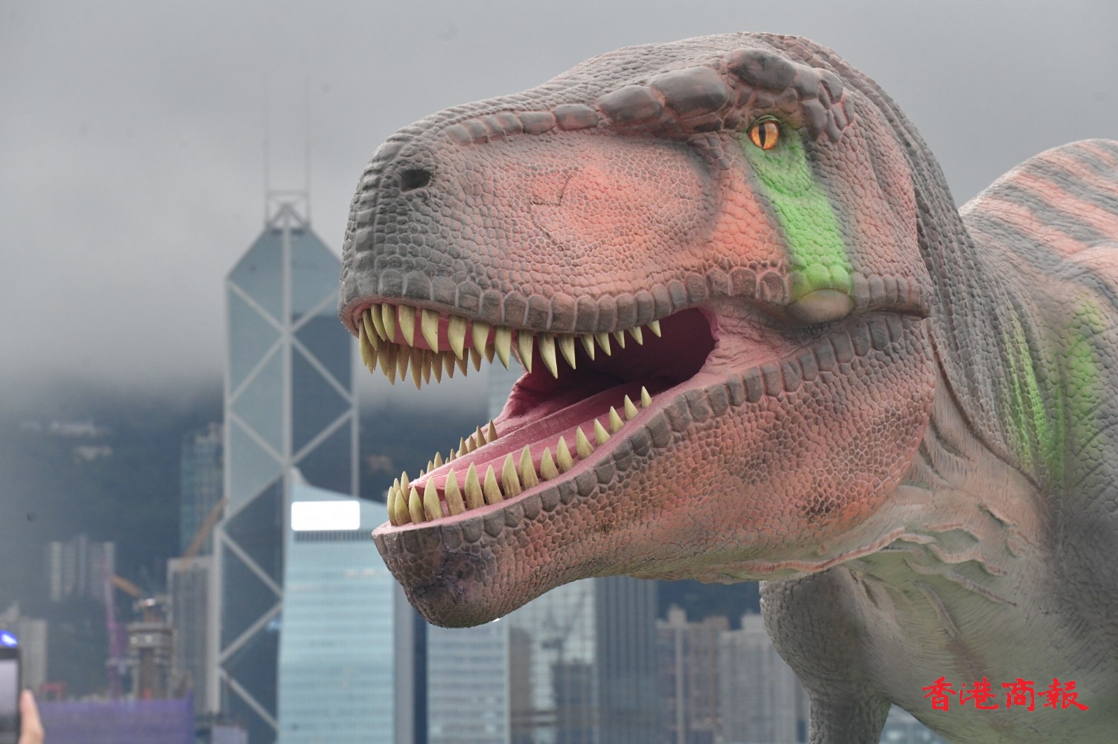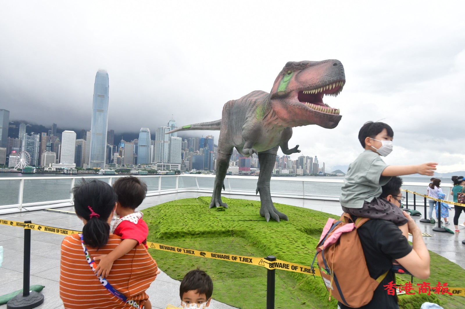 即使連日雨勢較大,兩隻恐龍也不減磅薄氣勢。在海港城及維港背景下,更讓人倍感震撼。有市民在繁喧鬧市的恐龍前打卡時,模彷恐龍狂奔避走,亦相映成趣。(記者 攝影 崔俊良)