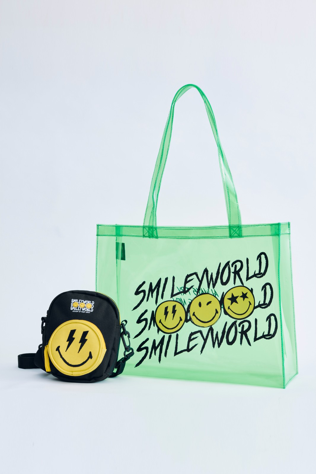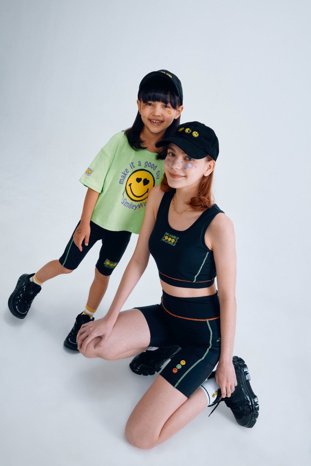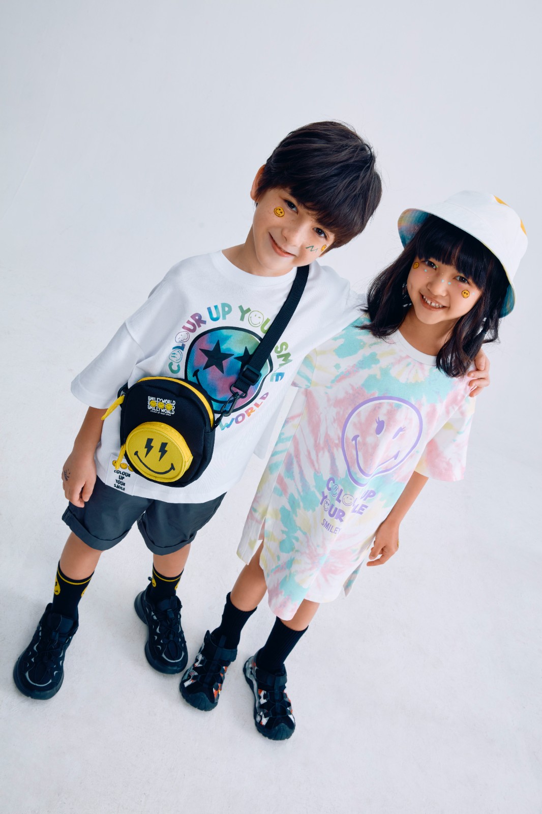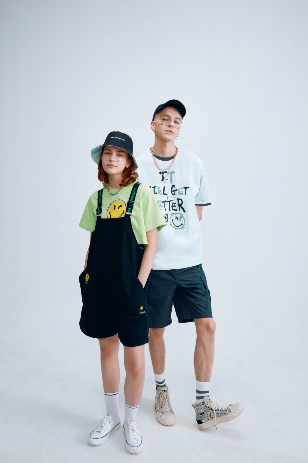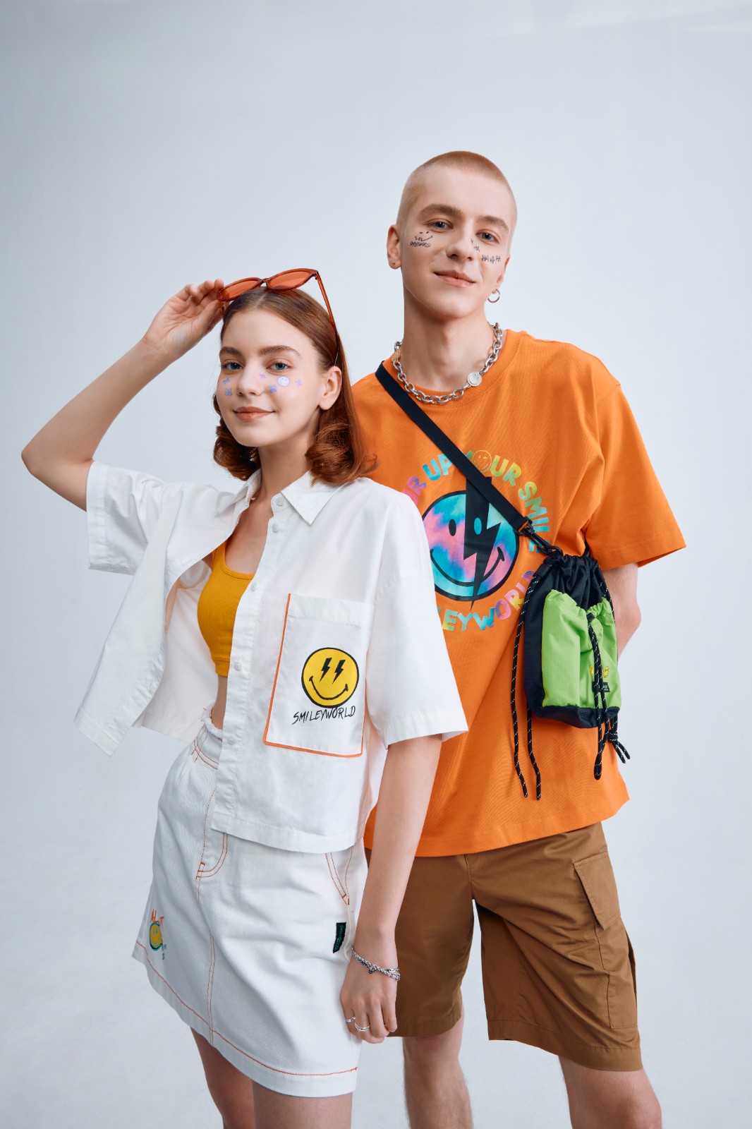 是次聯乘系列的服裝及配飾印上了不同正能量標語,並有色彩繽紛的「微笑」印花圖案,充滿活力。搶眼的黃色SmileyWorld笑臉與百搭易襯的黑白色系單品完美配合,女士可選擇充滿玩味的螢光色系設計T-shirt,配襯同系列的黑色牛仔吊帶連身裙或褲款,不失型格感覺。童裝設計承襲了成人款式設計,只要加一頂笑臉Cap帽,或系列的斜孭袋,即時搭配家庭裝,以可愛活潑形象與家人一同出遊。