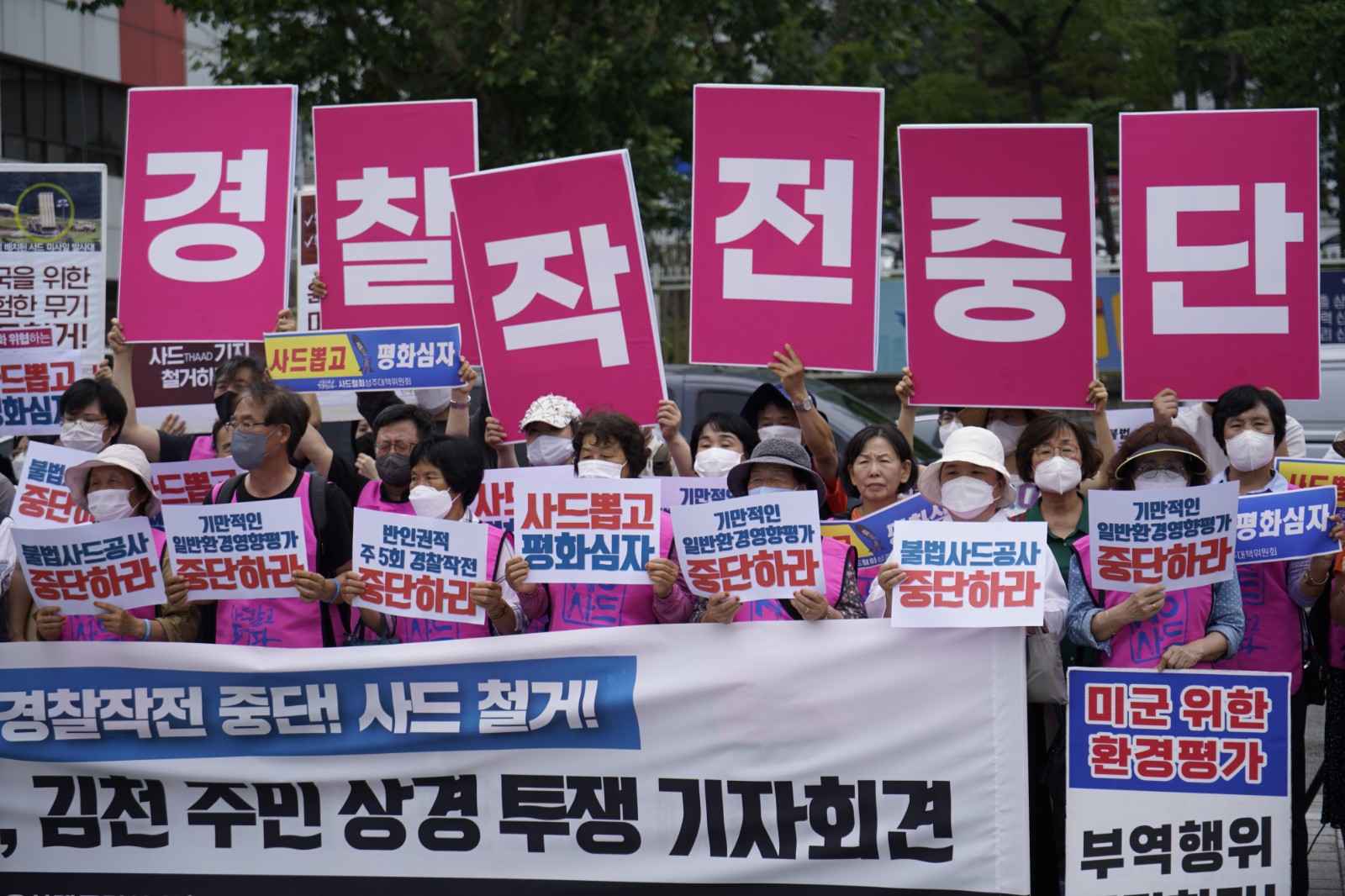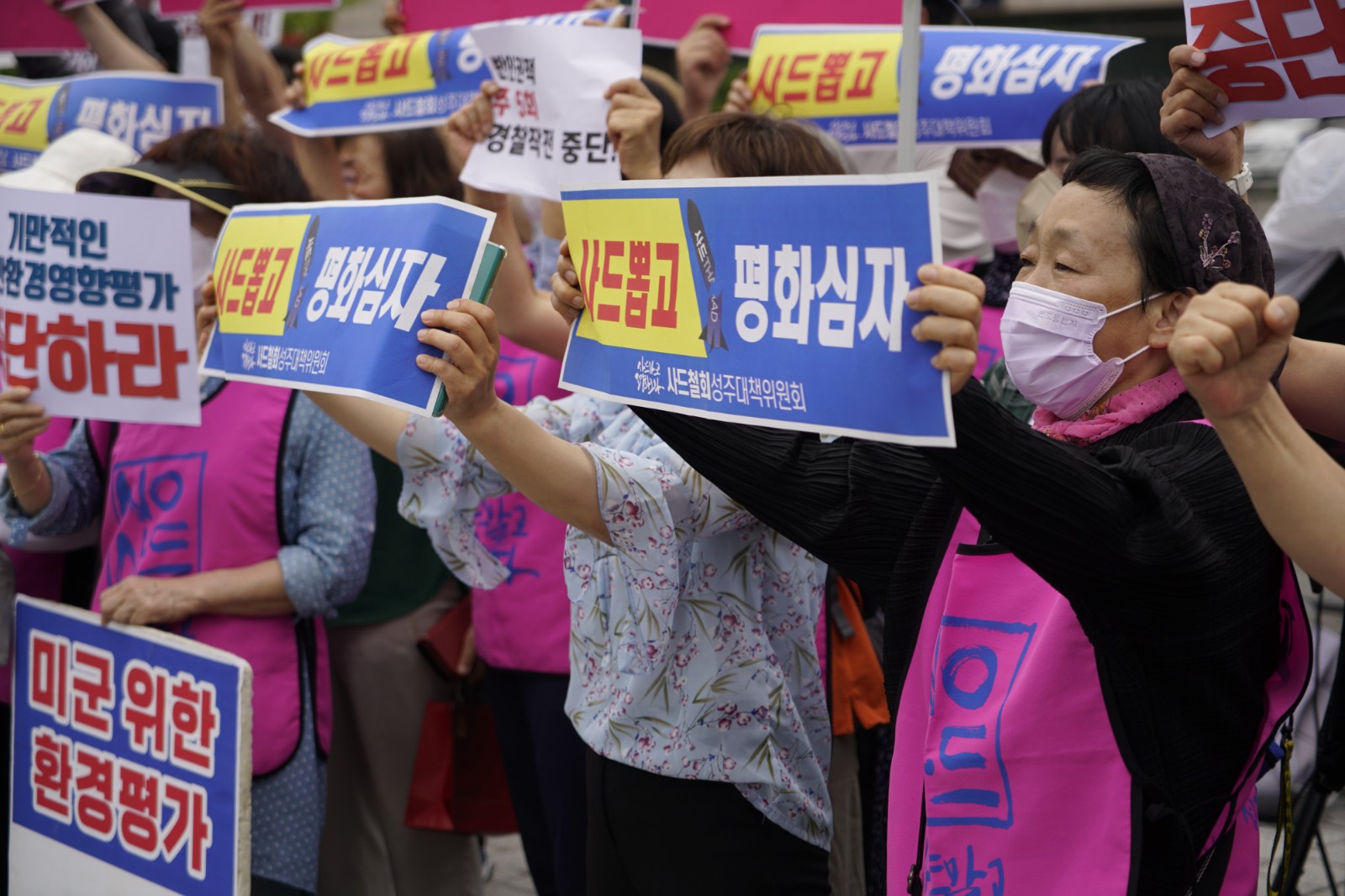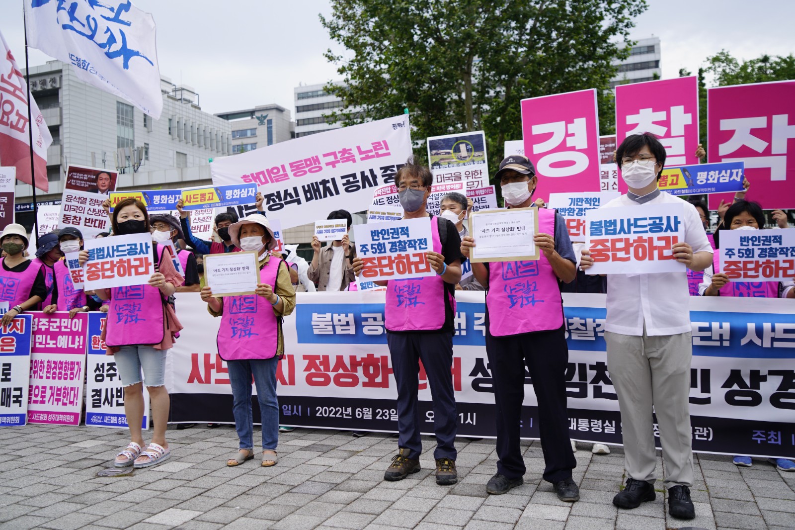 當地時間6月23日,來自「薩德」反導系統在韓部署地的民眾來到首爾市龍山區韓國總統府前舉行抗議集會,呼籲韓國政府將「薩德」系統撤出韓國。(圖源:中新社)