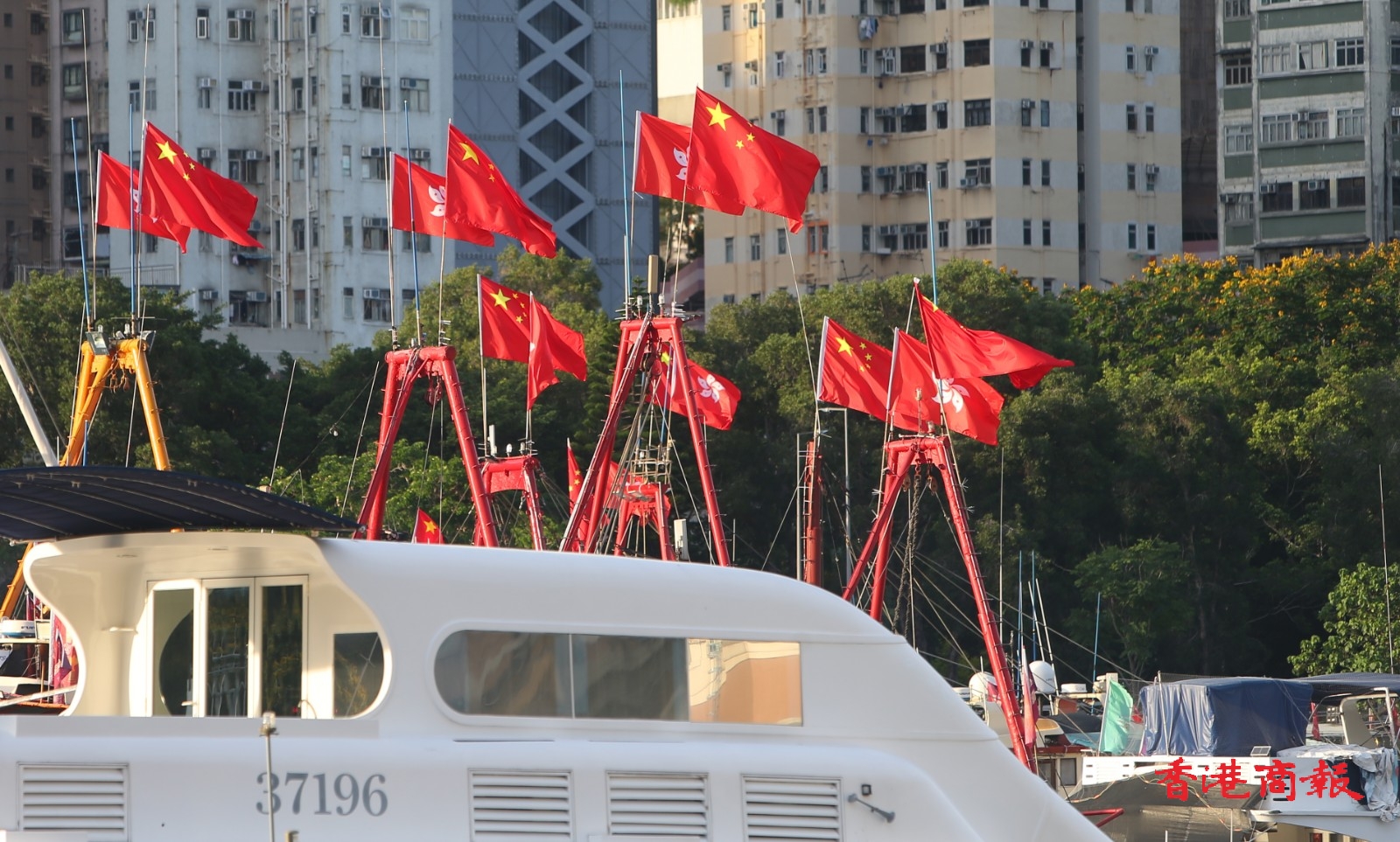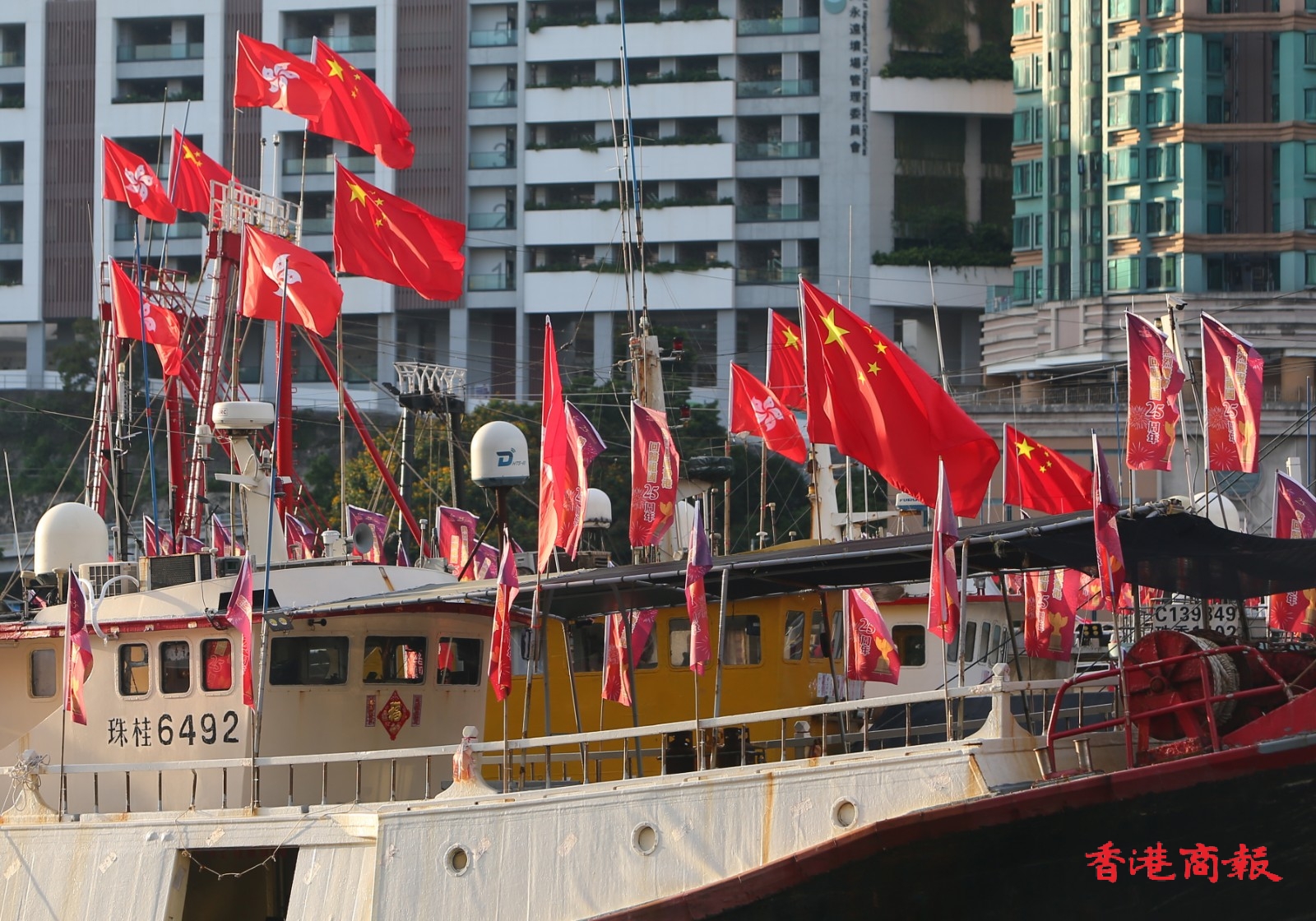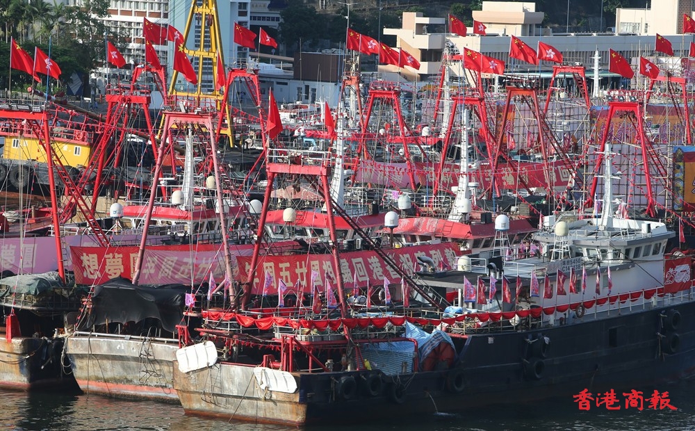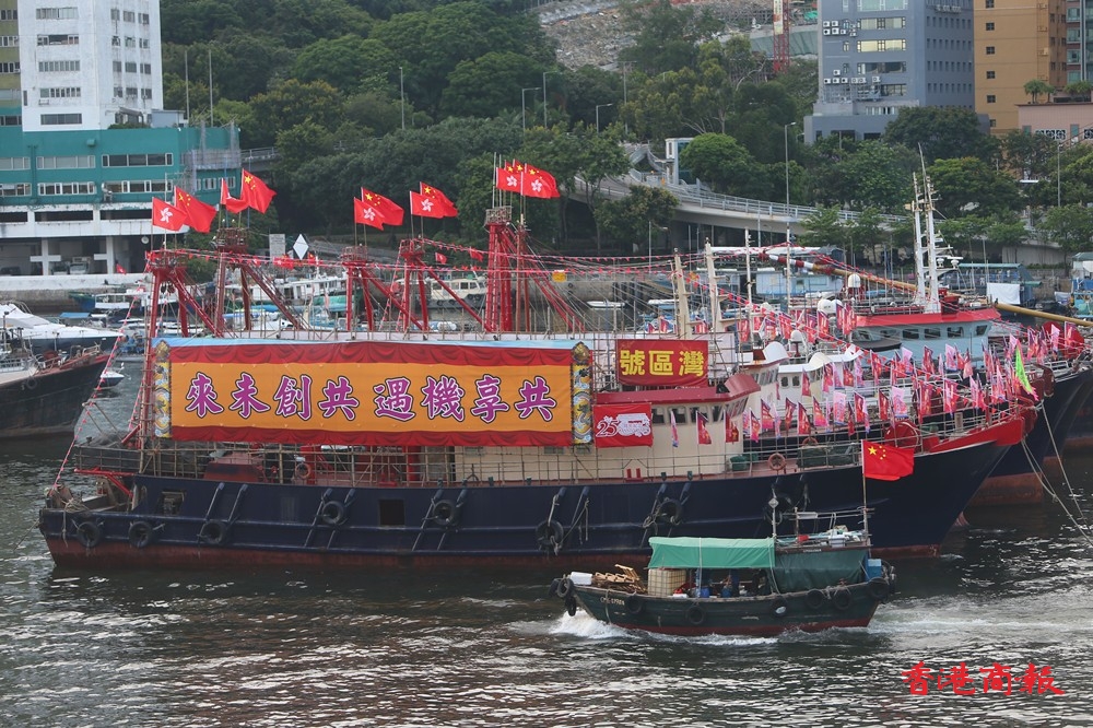 為慶祝香港回歸祖國25周年,香港仔避風塘多艘漁船都掛上國旗區旗,旗海飄揚下,充滿喜慶氣氛。當中有漁船掛起大型花牌,寫上「同心慶回歸 同行創新篇」的祝賀標語,極為吸睛。(記者 志誠 攝)