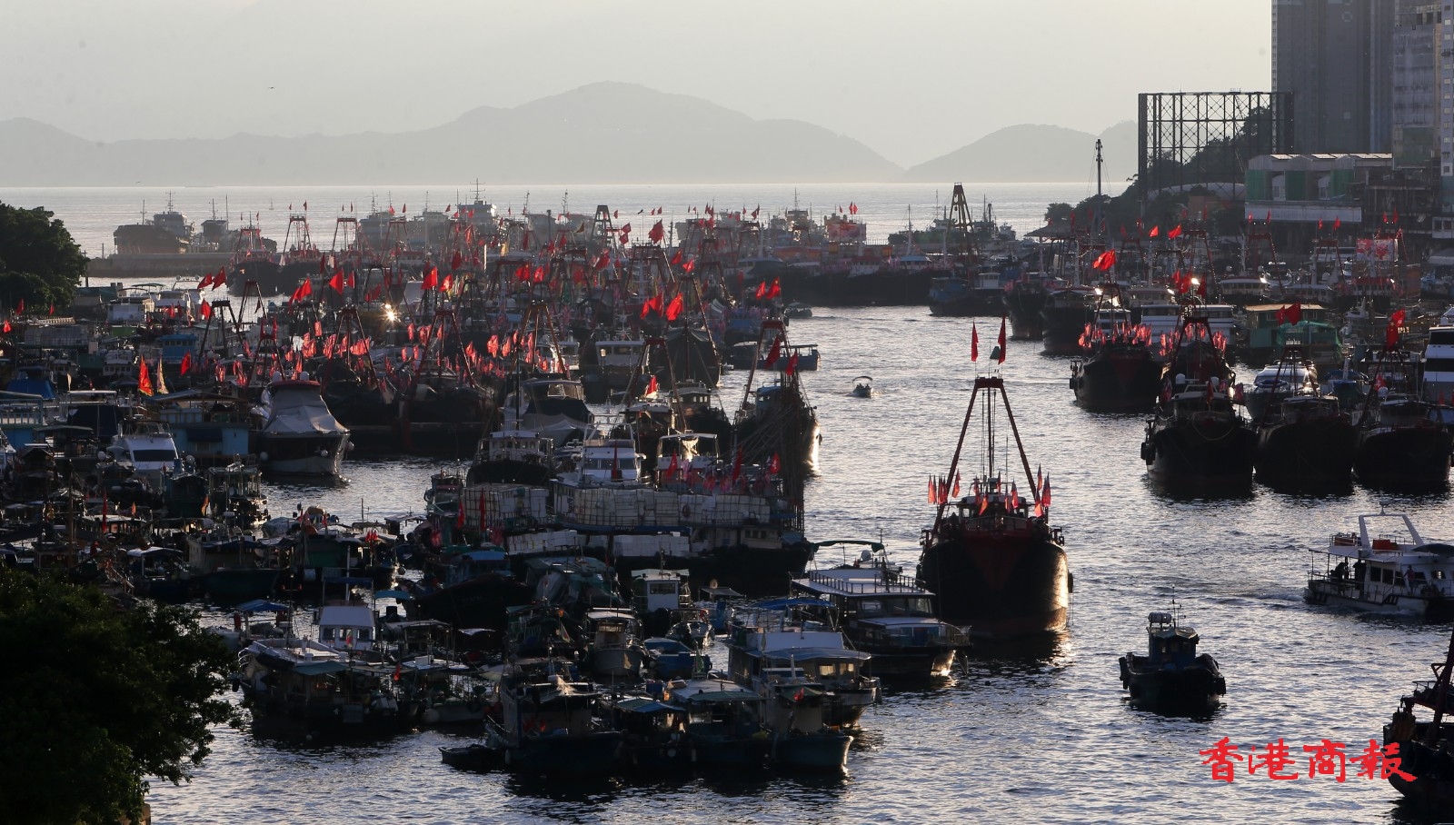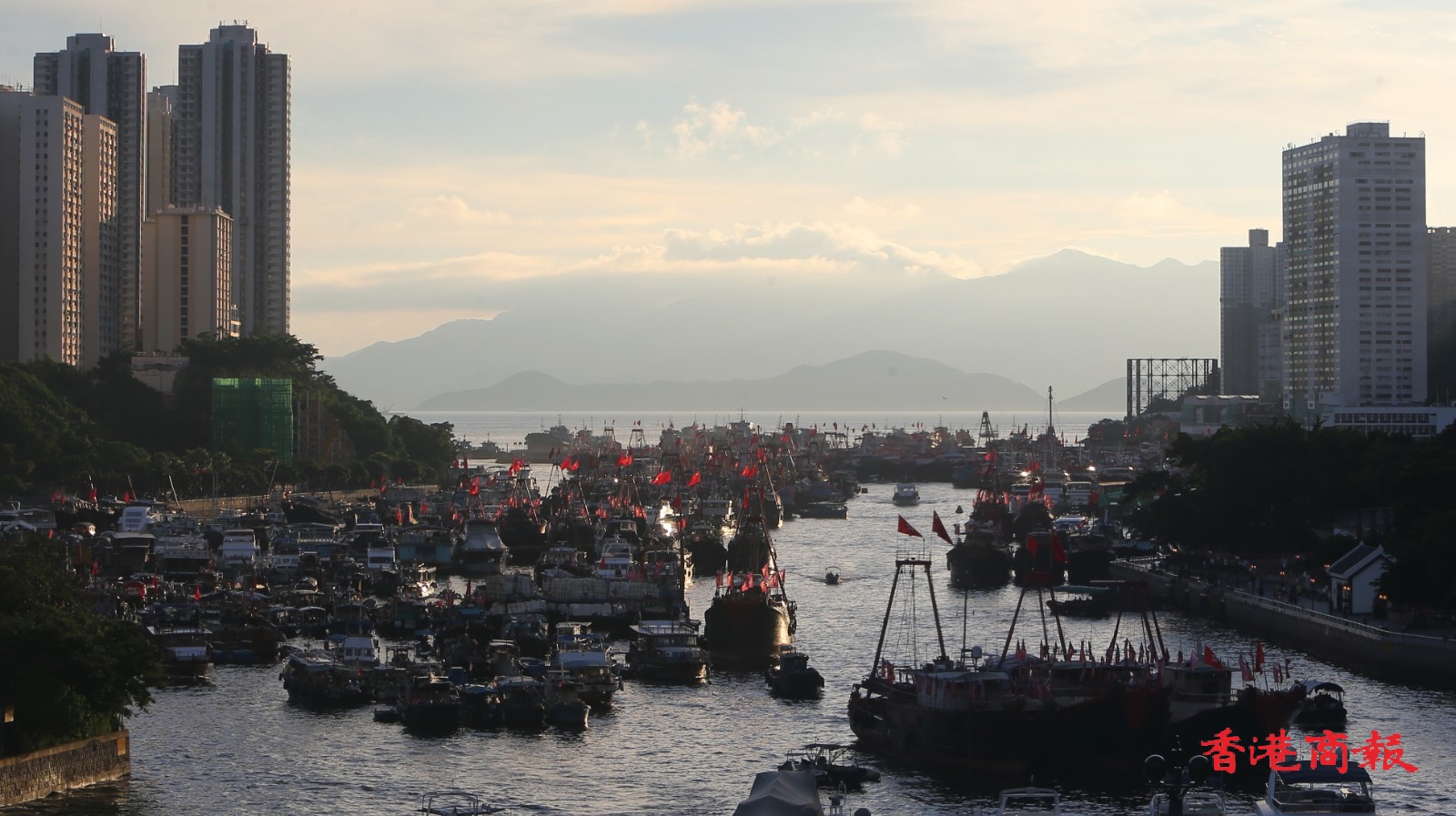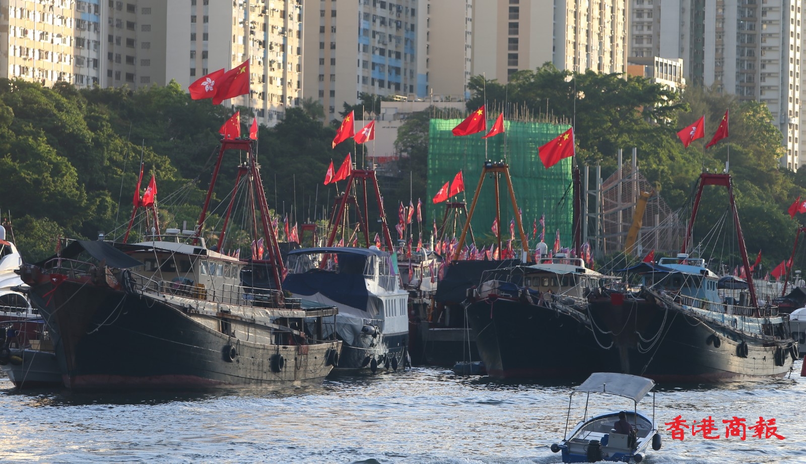 為慶祝香港回歸祖國25周年,香港仔避風塘多艘漁船都掛上國旗區旗,旗海飄揚下,充滿喜慶氣氛。當中有漁船掛起大型花牌,寫上「同心慶回歸 同行創新篇」的祝賀標語,極為吸睛。(記者 志誠 攝)