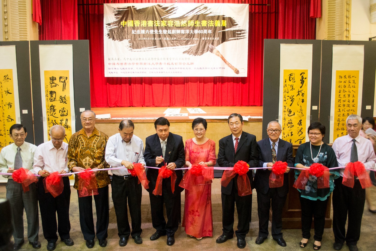 容浩然通過書法展覽,推動中外文化藝術交流。圖為他於馬來西亞吉隆坡舉辦師生書法義展,並將義展收入捐給當地的中文學校,幫助吉隆坡華人。
