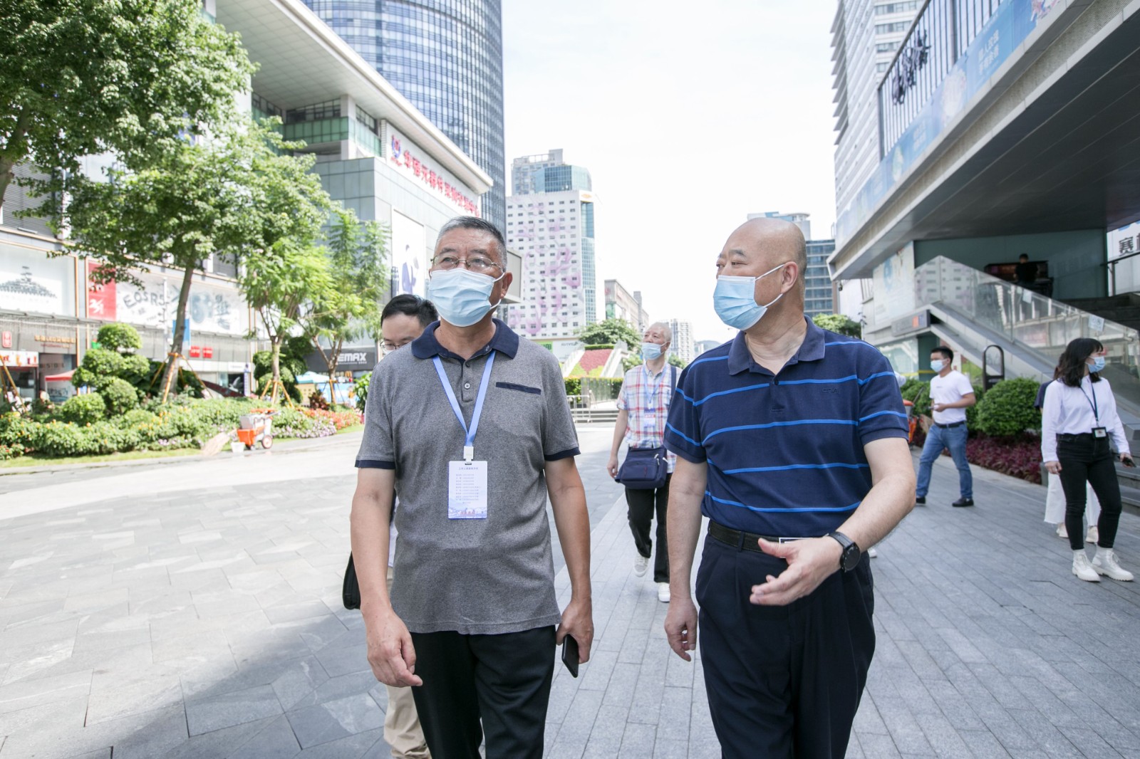 劉仁根(右)在向許輝(左)介紹華強北步行街概況