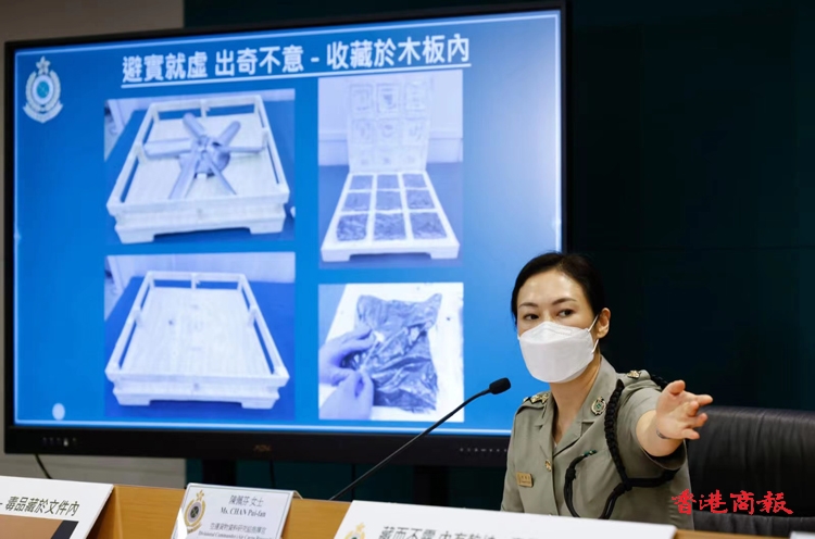 陳佩芬指出,毒販以毒品混進雜貨偷運進香港,將少量毒品夾雜在大批雜貨當中,增加海關偵測難度。在本年首六個月,海關機場科偵破同類方式走私毒品案件共34宗,比去年同期13宗增加1.6倍。陳佩芬舉例說,本年1月由加拿大入口的100件雜貨中,其中一貨件中檢獲0.9公斤大麻花,另一宗在本年4月由德國入口的雜貨,關員在300件貨件中發現其中一箱貨中藏有1900粒搖頭丸。