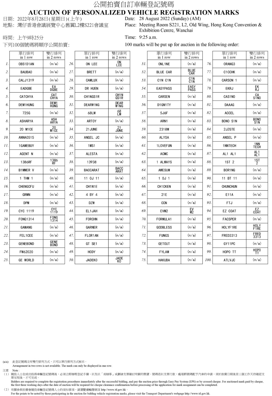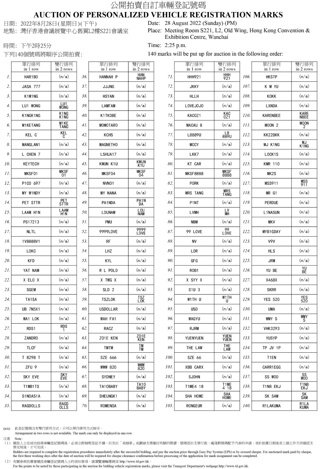 運輸署今日(15日)宣布,自訂車輛登記號碼拍賣會於8月28日(星期日)在灣仔香港會議展覽中心舊翼L2樓S221會議室舉行。