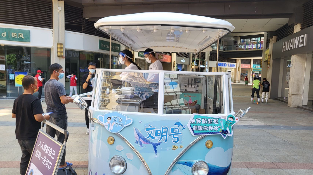 此前一身「時尚裝扮」,答題可換美食的「文明號」,近日變身抗疫宣傳車。宣傳車乘載着宣傳員沿街移動式勸導市民佩戴口罩、大喇叭雙語宣傳防疫規範、派發防疫宣傳單和「文明」宣傳口罩......深圳大鵬辦事處通過多種形式廣泛發動市民積極參與到文明實踐活動中來,助力抗疫,守護深圳。