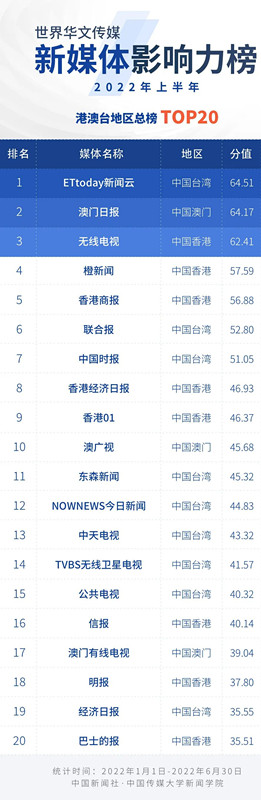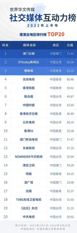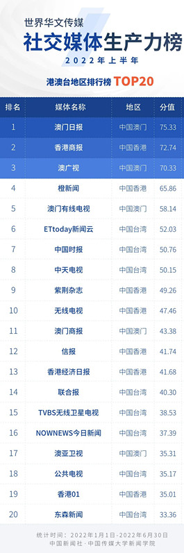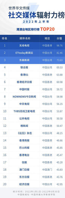 中國新聞社與中國傳媒大學新聞學院持續開展「世界華文傳媒新媒體影響力」測評項目,現根據2022年上半年世界華文傳媒新媒體的業務數據,發布2022年上半年榜。