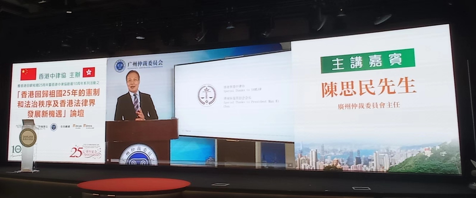 陳思民則以《努力把南沙打造成中國仲裁先行區,把廣州打造成全球互聯網仲裁首選地》為題,指建設粵港澳大灣區是習近平主席親自謀劃、親自部署、親自推動的重大國家戰略。陳主任指出廣仲在大灣區的政策下,堅持做案件、堅持做標準、堅持做文化,制訂制定並向全球發布首個互聯網仲裁推薦標準(廣州標準),目前已得到中國內地150餘家仲裁機構,以及40餘家境外仲裁機構的認可和協同推廣。陳主任希望日後廣仲能夠加強穗港合作,進行開展涉外仲裁聯合培訓,打造國際一流人才隊伍;聯合舉辦全球高端仲裁論壇,加強國際交流與合作等工作。