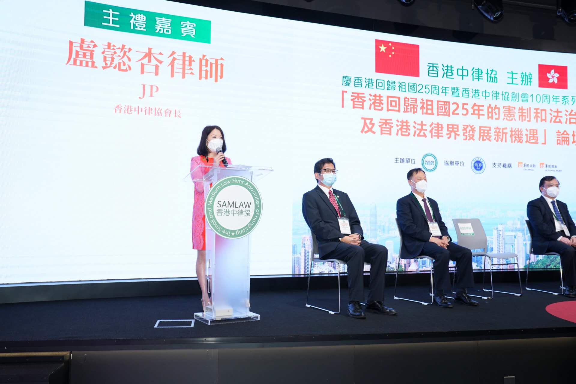 盧懿杏致歡迎辭時表示,感謝參加高端論壇的嘉賓及與會人士,並介紹本會是由一群在香港中小型律師行執業的律師,於2012年所發起的自發組織,目標在於促進香港中小型律師行的共同發展;提升香港法律界在香港及內地法律服務市場的競爭能力以開拓商機;為事務律師及大律師營造有利的執業環境增強競爭力;以及推廣業界共同互助服務及團結業界。盧會長續指,今年是香港回歸祖國25周年,適逢香港中律協創會10周年,故本會籌辦包括今日高端論壇在內一系列的慶祝活動。