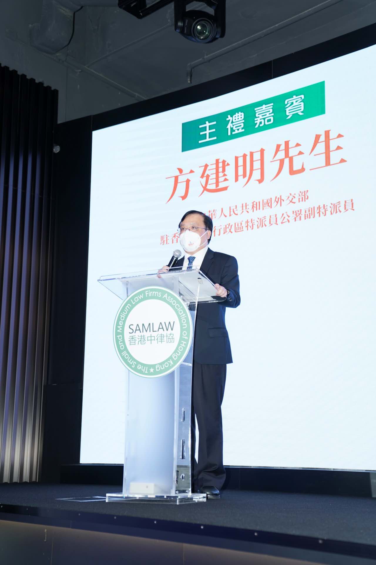 方建明則以《同心護法治,協力促發展》為題致辭,分享法律界同仁應有共同責任和使命的三點看法。第一,捍衛特區憲制秩序,是每一位法律界同仁的光榮使命;第二,維護特區法治秩序和形象,是每一位法律界同仁的應盡義務;第三,提升特區法律服務優勢,是每一位法律界同仁的專業職責。當中的第三點,方副特派員強調香港法律界更應主動發揮專業所長、服務國家發展大局、對接國家發展戰略,為特區打造國際創科中心提供更優質的專業服務和軟環境,共同推動香港在新起點上實現更好發展。