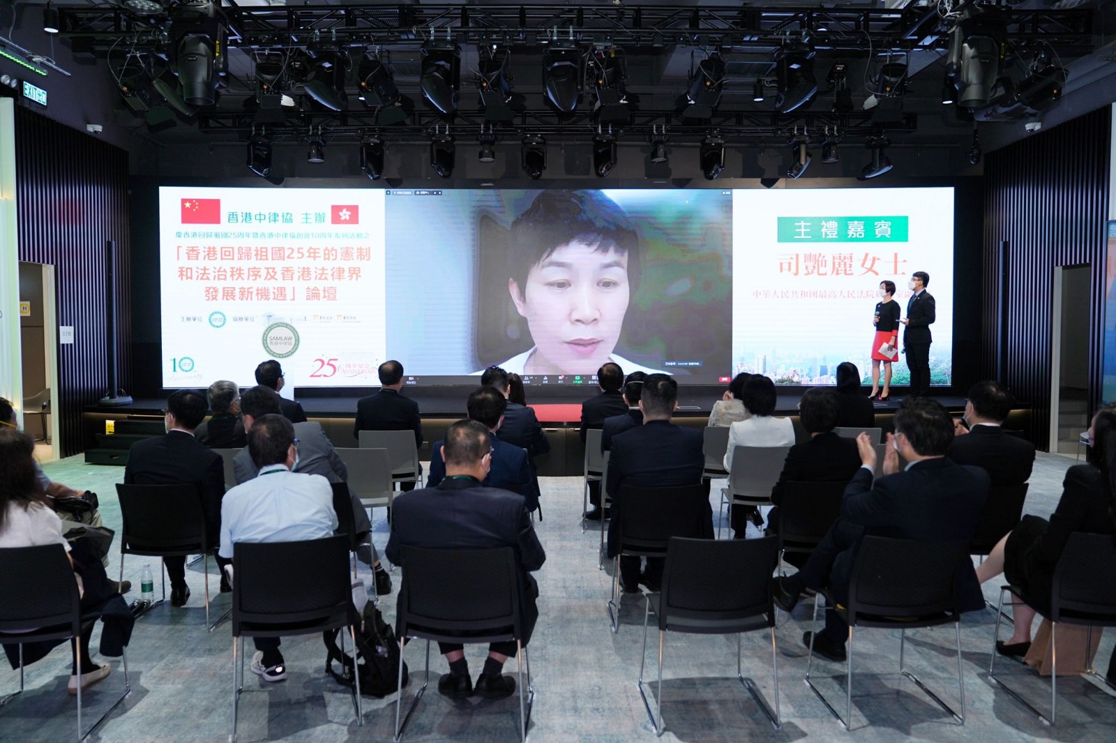 司艶麗在發言時提出三大觀點,包括香港法治為香港保持獨特地位和優勢提供重要保障;區際司法法律交流合作爲香港法律界發展提供新機遇;以及香港法律專業人才是國家涉外法治建設重要資源。司副主任續指,最高人民法院將一如既往支持本會等愛國愛港法律團體同內地加強交流合作,最大限度爲香港法律專業人才深度參與國家法治建設提供支持和幫助。