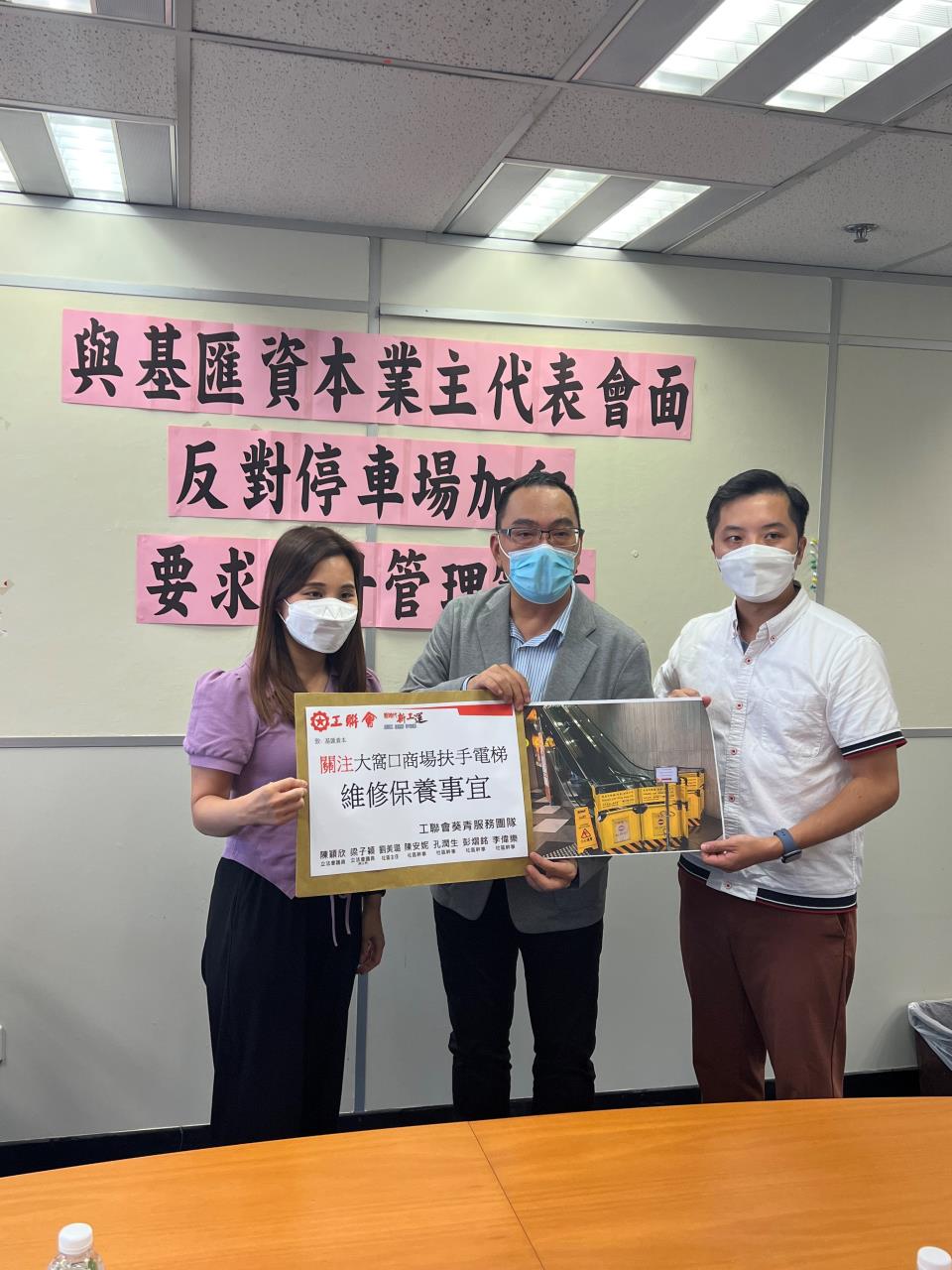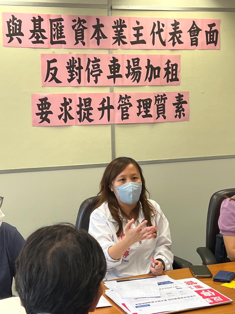 在疫情嚴峻的情況下,基匯資本民坊於2021年已在葵青區多個停車場大幅加租;而目前疫情未停,基層市民生活仍然艱困,基匯資本自今年8月起再次先後在葵青區旗下6個停車場大幅加租,令車主的經濟負擔百上加斤。此外,各停車場的服務質素惡劣,環境衛生堪虞,多項設施損壞卻長時間未見維修,更深受鼠患困擾,作為業主的基匯資本責無旁貸。葵青區議會主席盧婉婷聯同葵青地區前線服務工作者伍志華、吳任豐、孔潤生、陳安妮、陳笑文今日(22日)與基匯資本業主代表會面,除表達反對停車場加租,亦要求提升停車場及商場管理質素。