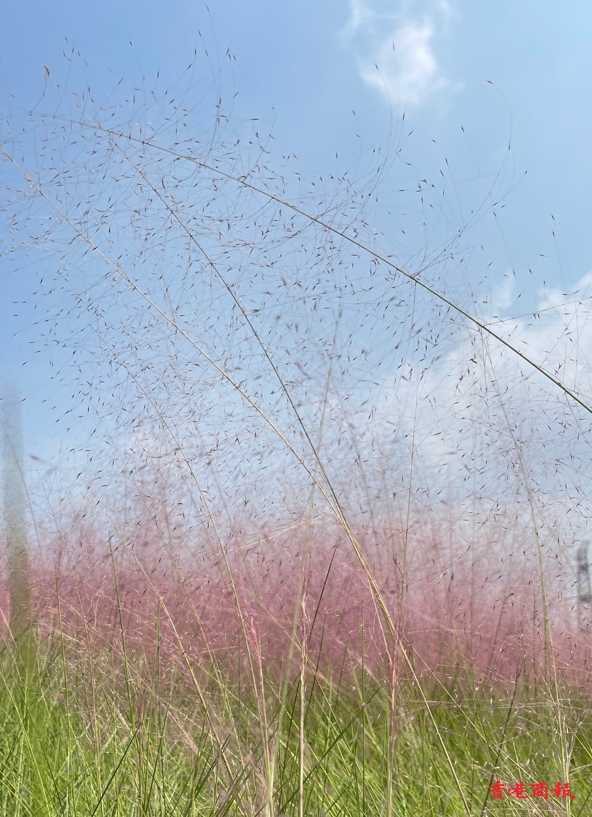 纖細的綠杆,粉粉的草穗,「少女」一般的粉黛子,成團簇擁着,遠遠望去就像一團團粉紅色的雲霧漂浮在地面上,有一種粉紫色花穗如髮絲從基部長出,遠遠望去,宛如棉花糖一樣輕盈縵紗、隨風搖曳。暖洋洋的粉色花海,空氣裏都瀰漫着浪漫的氣息。