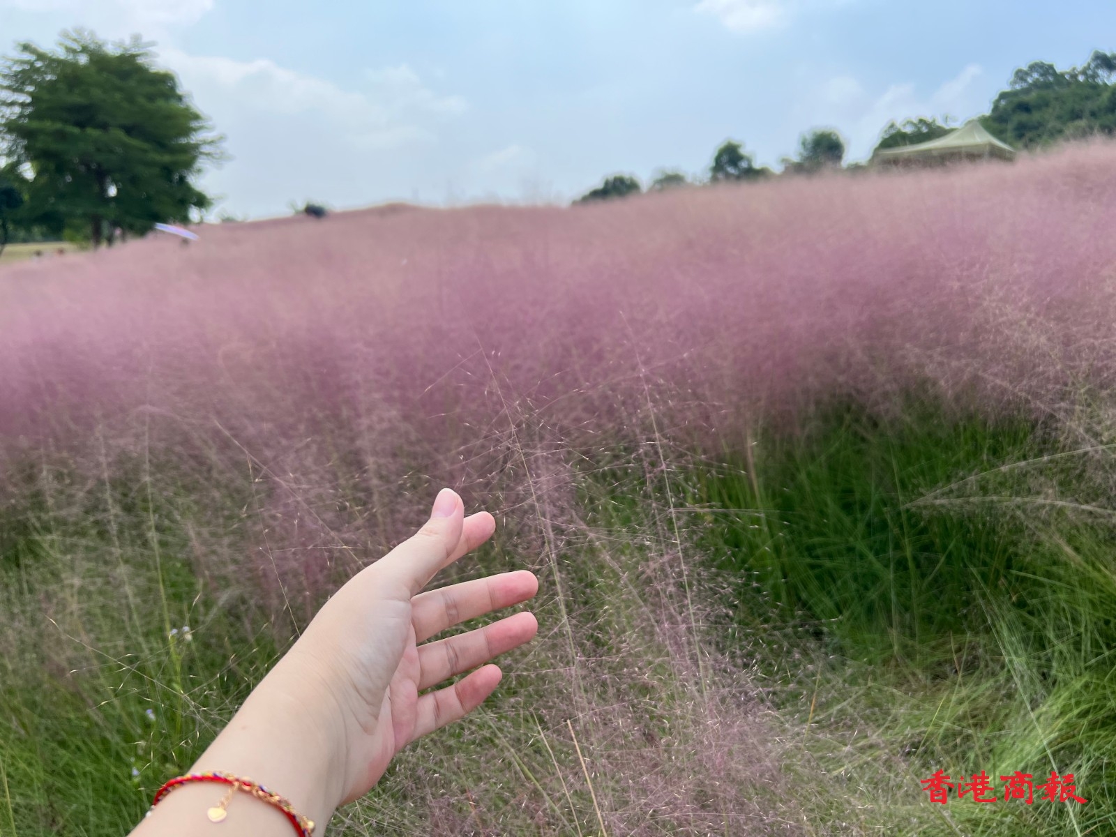 公園面積很大,秋風拂過,大片的粉黛草隨風搖曳,輕盈地捲起一陣粉色的波浪,層層粉色浪花撲面而來,氛圍感十足。