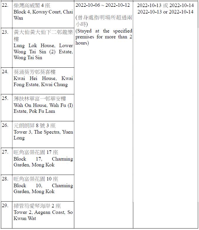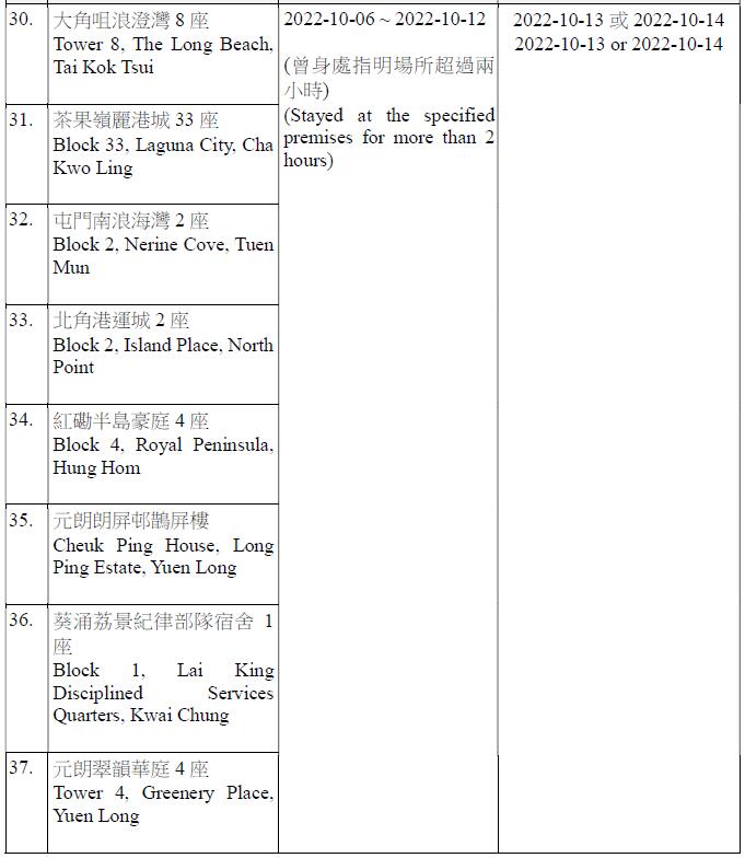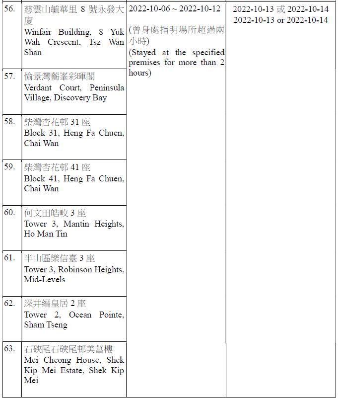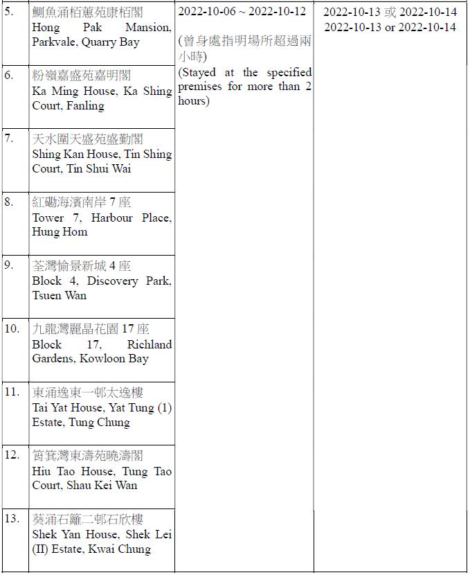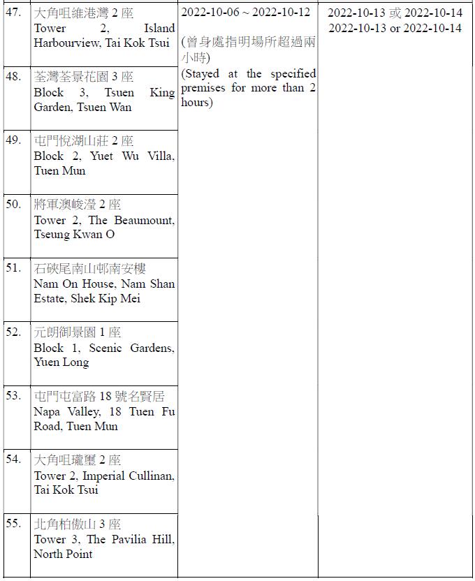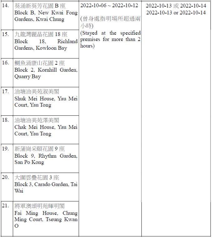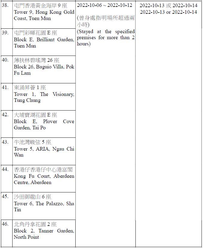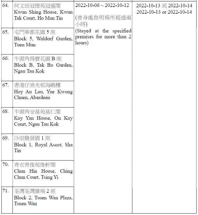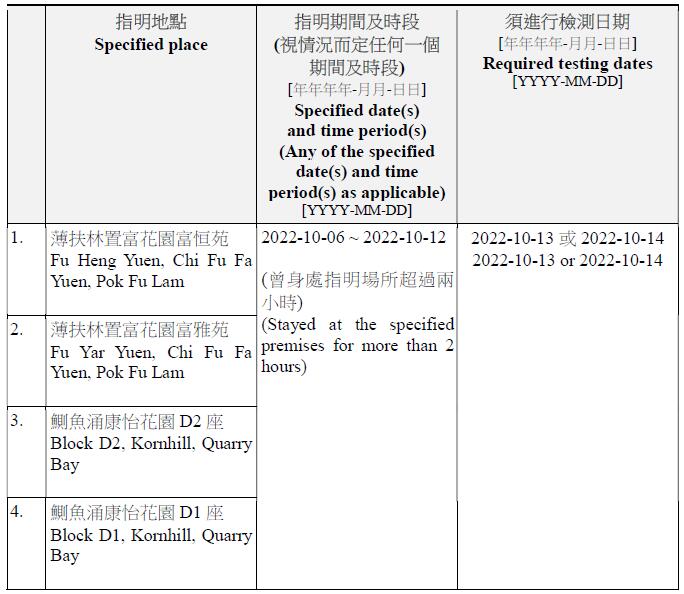 因應多宗陽性檢測個案,及採集到檢測呈陽性的污水樣本,港府今晚(12日)就強制檢測公告刊憲,要求於指定期間曾身處75個指明地方的人士,須在10月13日或10月14日接受核酸檢測,包括慈雲山慈民邨民健樓、藍田滙景花園10座、將軍澳疊翠軒4座、荃灣石圍角邨石蘭樓、鰂魚涌栢蕙苑康栢閣、粉嶺嘉盛苑嘉明閣、天水圍天盛苑盛勤閣、紅磡海濱南岸7座、荃灣愉景新城4座、九龍灣麗晶花園17座等。