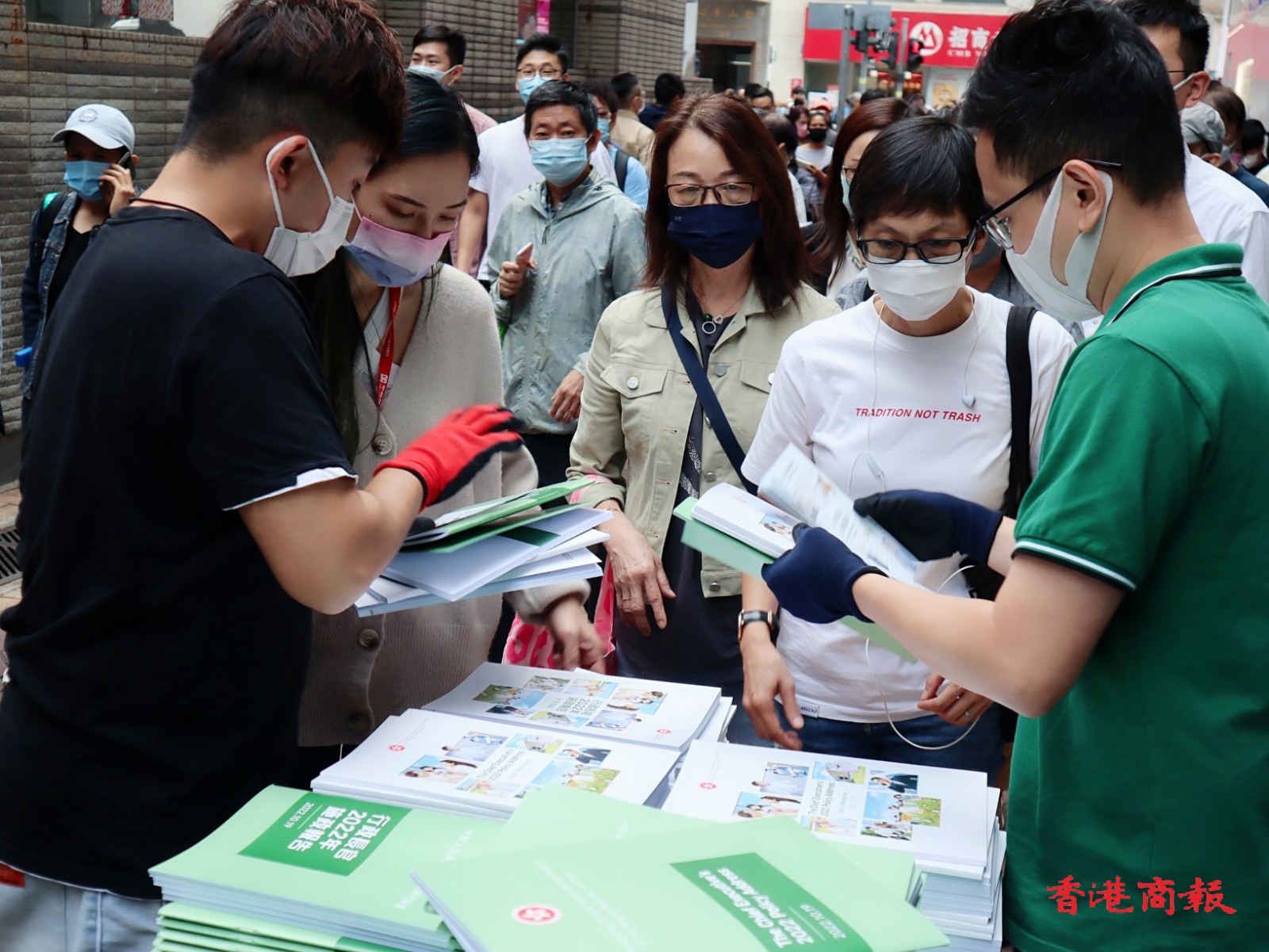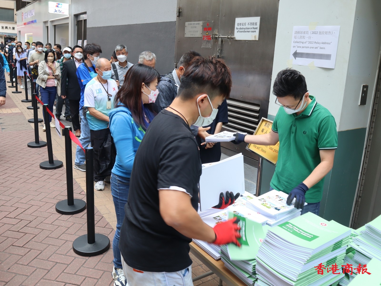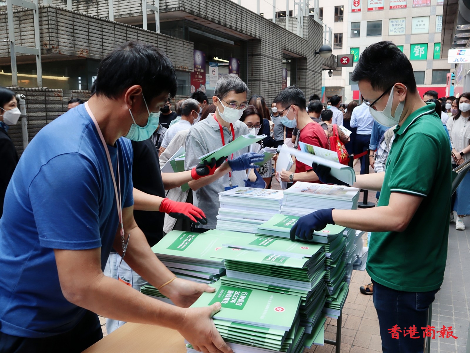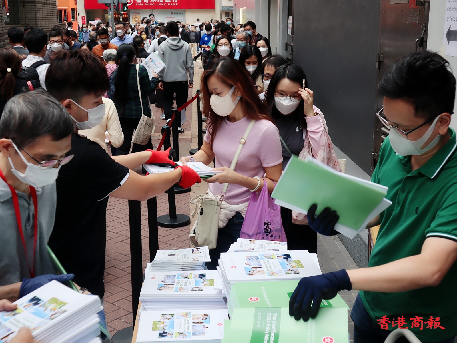 大批市民在灣仔民政事務處索取行政長官2022年施政報告。记者 馮瀚文攝