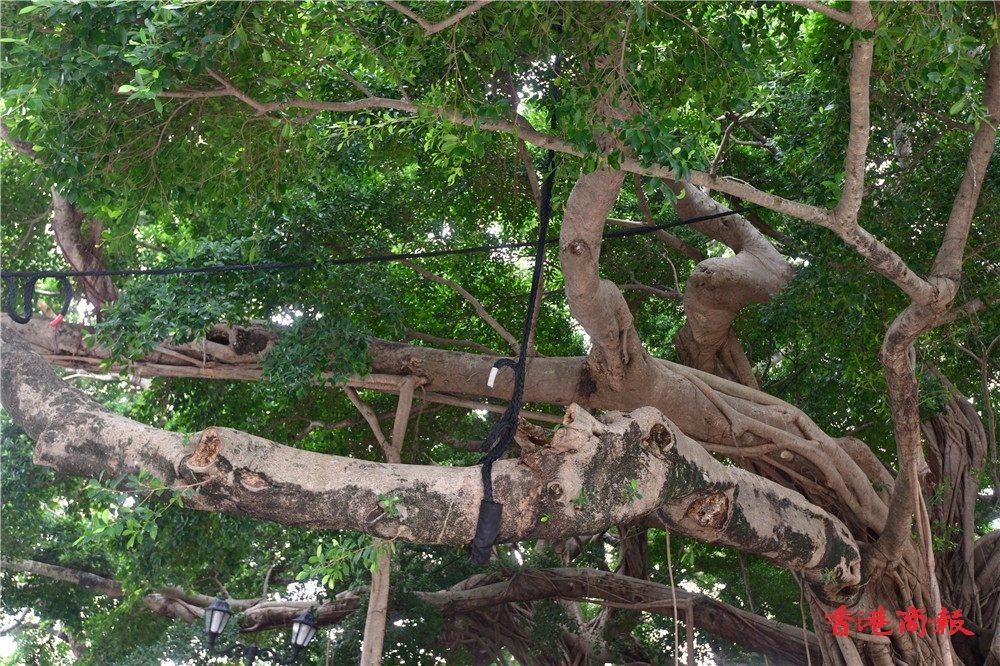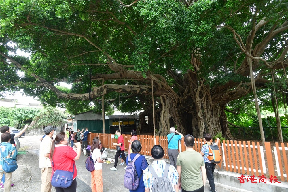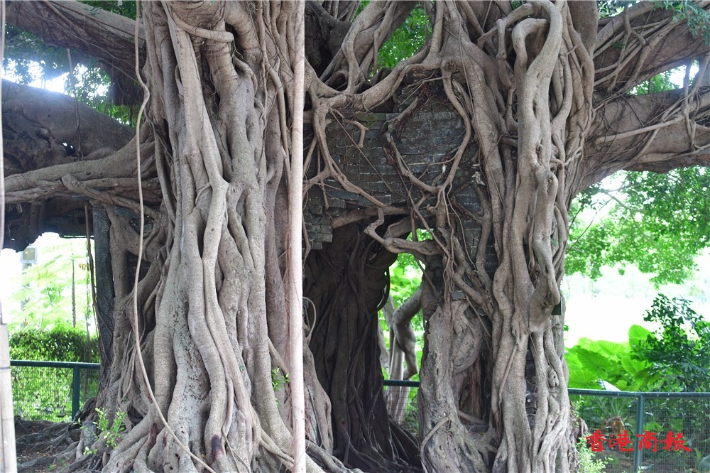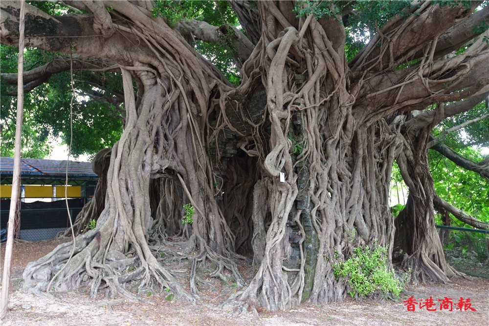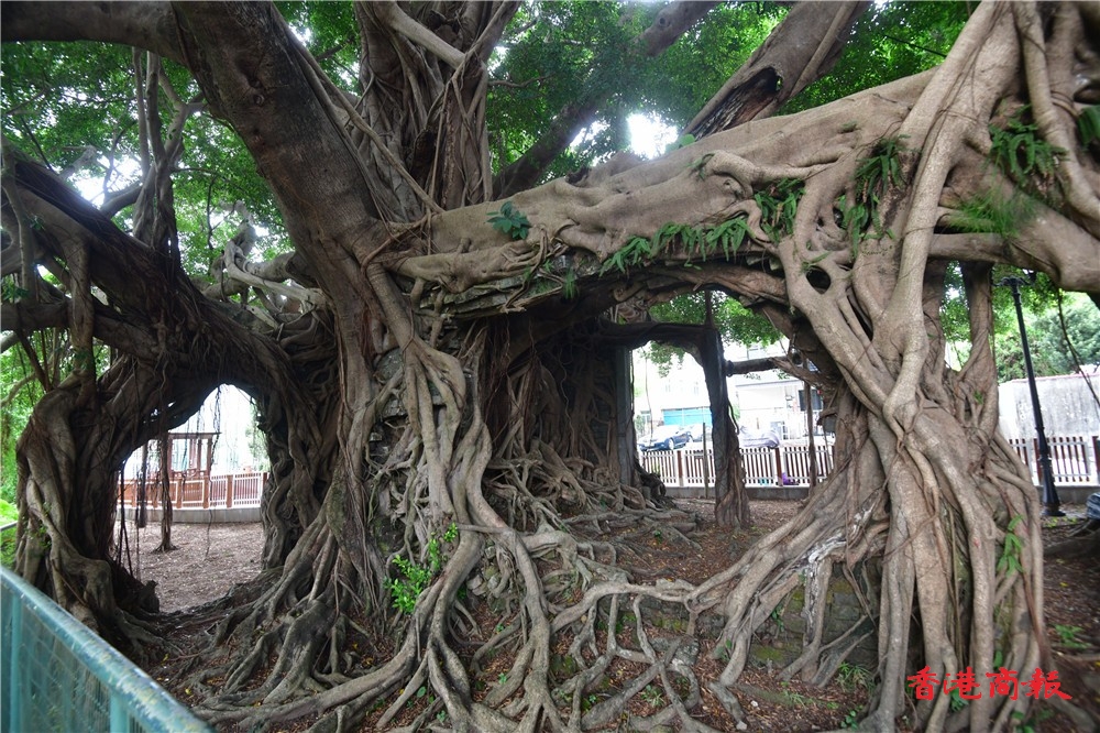 由於早年不少村民離開錦田,導致該廟無人打理,荒廢至今。這棵在石屋旁的老榕樹持續生長,最終將整間石屋包圍,成為今天的百年樹屋。這棵老榕樹氣根如同簾幕,形態出眾,已被納入香港的《古樹名木冊》,是錦田充滿歷史回憶的地標。(崔俊良 攝)