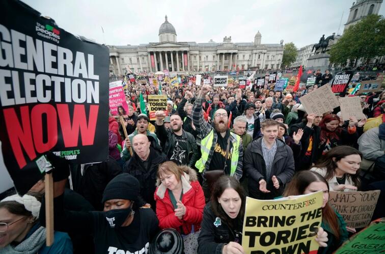 隨着俄烏戰事爆發,英國的能源價格被推高,通脹亦進一步飆升。當地時間周六(5日),數千名民眾雲集英國首都倫敦市中心,抗議生活成本過高,並要求立即舉行大選。