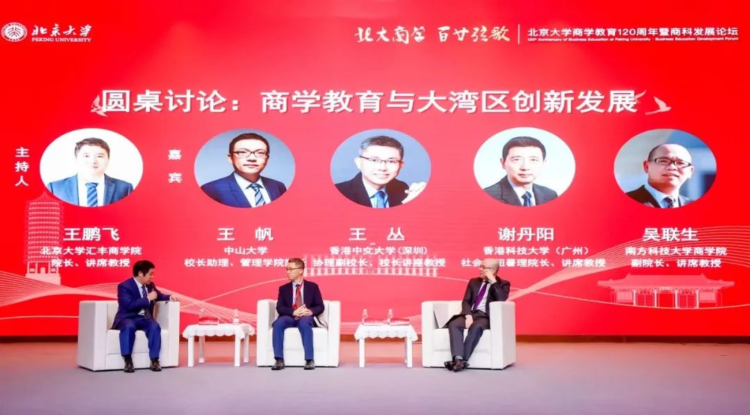 在主題為「商學教育與大灣區創新發展」的圓桌討論中,中山大學校長助理、管理學院院長王帆,香港中文大學(深圳)協理副校長、校長講座教授王叢,香港科技大學(廣州)社會樞紐署理院長、講席教授謝丹陽,南方科技大學商學院副院長、講席教授吳聯生就所在院校研究創新理論、培養頂尖人才、服務社會發展等方面的情況作了介紹,並進行深入討論。本場圓桌討論由王鵬飛教授主持。