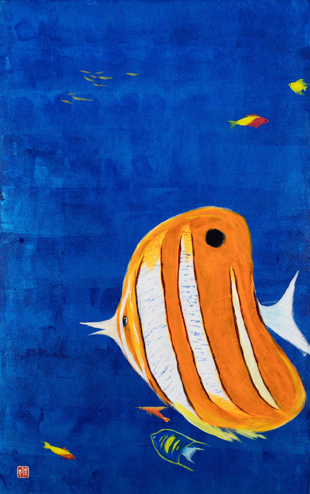 陳佳的畫中洋溢着童真的色彩,那些明麗的、跳躍的色彩純粹美好,在其作品中既能看到傳統文化的元素,又有着類似油畫的表達。畫面傳達的情感純真細膩,她用清新的色彩表達充滿力量的主題,在顏色的運用上大膽而富有想像力。蔚藍的海洋與潔白的海浪如同抒情的詩篇,激流中的孤帆堅韌頑強;簡潔的藍色背景表現出海底世界的幽深靜謐,熱烈的橙色表現出活躍的生命。她的作品承載着對自然與生活的種種情感與感悟,從內心出發,與自然景物相融相應,呈現出返璞歸真的獨特個性。
