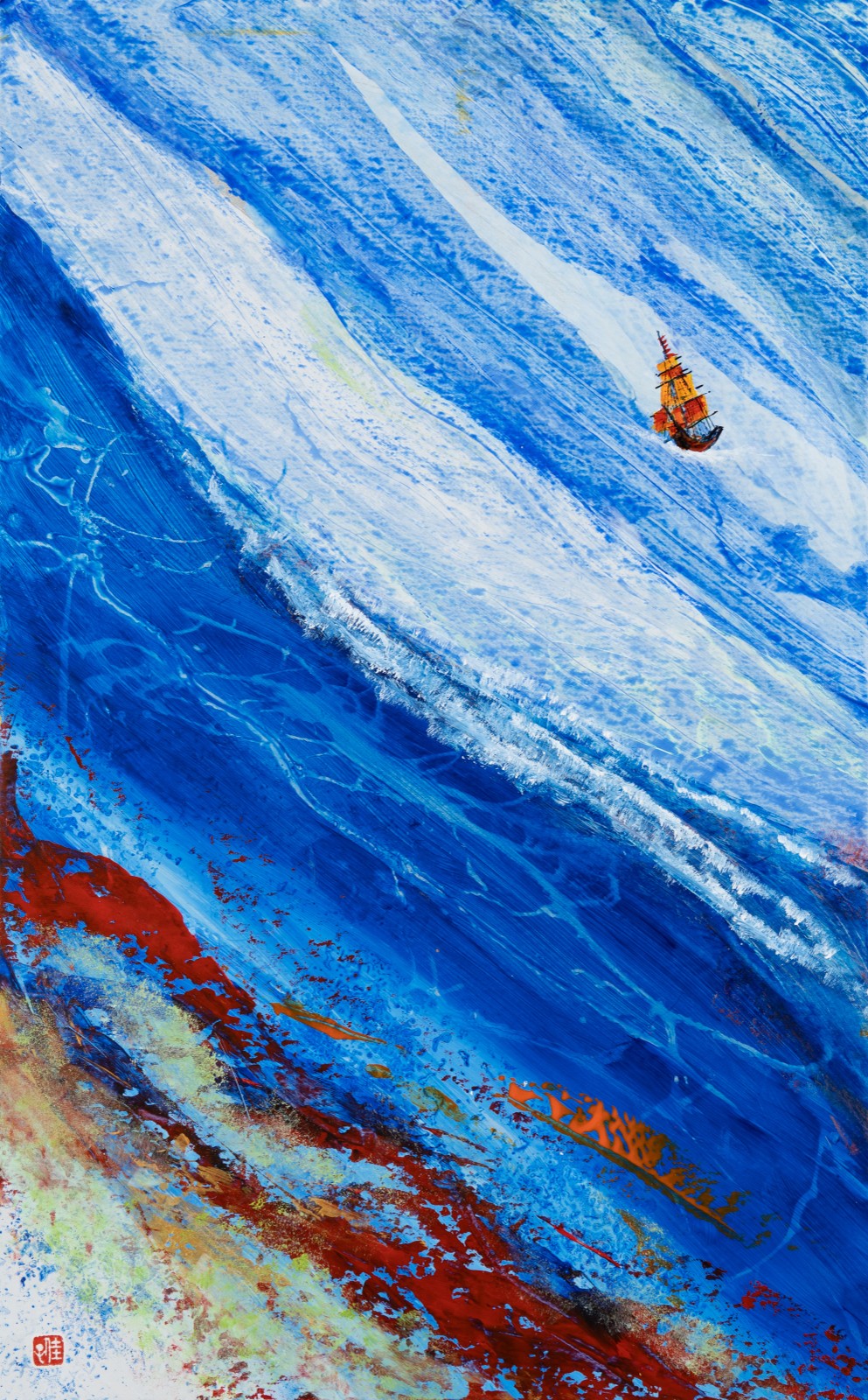 《乘風破浪》的畫面呈對角線構圖,強調了不穩定的流動感,而海浪之下的紅色,在顏色上與帆船形成呼應,暗示洶湧的海浪下是一片危機與生機共存的世界。她用激烈的筆刷表現出海浪的奔湧,橘紅色的帆船在海浪中漂蕩,危機四伏中展現出一往無前的勇氣。唐代詩人李白在《行路難》中雲:「長風破浪會有時,直掛雲帆濟滄海。」道出了充滿信心與展望的強音,儘管前程障礙重重,但仍能乘長風破萬里浪,橫渡滄海到達理想的彼岸。