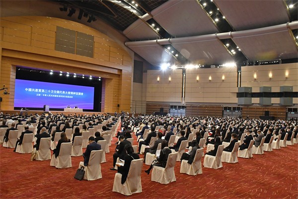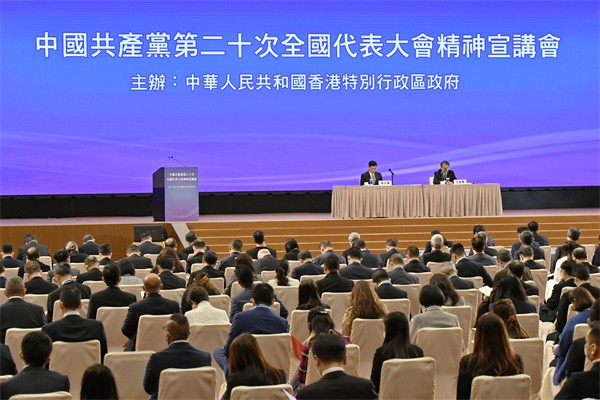 應特區請求,中央宣講團來港講解中國共產黨第二十次全國代表大會精神。特區政府今日(3日)在灣仔香港會議展覽中心舉行兩場中共二十大精神宣講會。宣講團成員包括全國人大常委會法制工作委員會主任沈春耀及全國政協經濟委員會副主任謝伏瞻。兩場宣講會由行政長官李家超主持,沈春耀和謝伏瞻主講。逾600人出席首場宣講會,包括特區政府官員、行政會議成員、立法會議員及司法界代表。約500名社會各界代表獲邀出席次場宣講會,包括港區全國人大代表、港區全國政協委員、主要政團社團代表,以及工商界、專業界、教育界、傳媒界及青年代表。