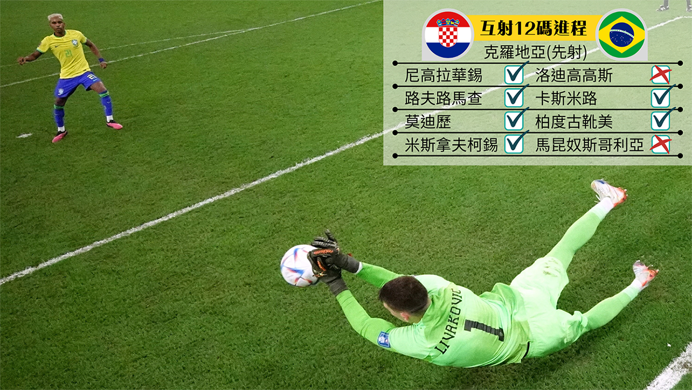 點球大戰中,先射的克羅地亞4輪球員全數命中,巴西先有第一輪的洛迪高高斯主射被利華高域擋出,去到第4輪又有馬昆奴斯哥利亞射中柱,結果格仔軍團繼16強踢走日本後,又一次憑12碼淘汰對手,成功躋身最後4強。