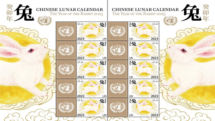 聯合國郵政管理局1月20日在紐約發行中國農曆癸卯兔年特別版郵票版張,慶祝中國農曆新年的到來。版張由每枚面值1.40美元的10枚郵票組成,郵票左半部分為聯合國會徽圖案,右半部分為中國設計師潘虎創作的工筆劃「月兔」圖,背景是祥雲圍繞的金色月亮。
