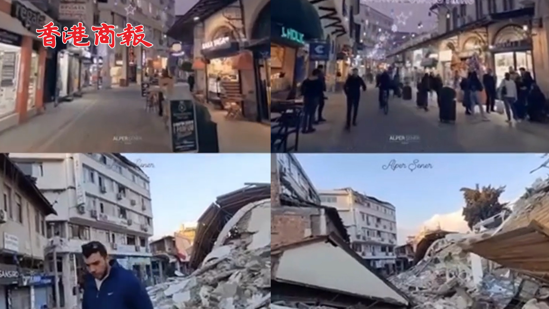 2月13日,一名攝影師在社交平台上傳了土耳其哈塔伊省安塔基亞市一條街道在地震前後的對比。地震前,街上掛滿裝飾、人頭攢動;地震後,只剩一片廢墟。