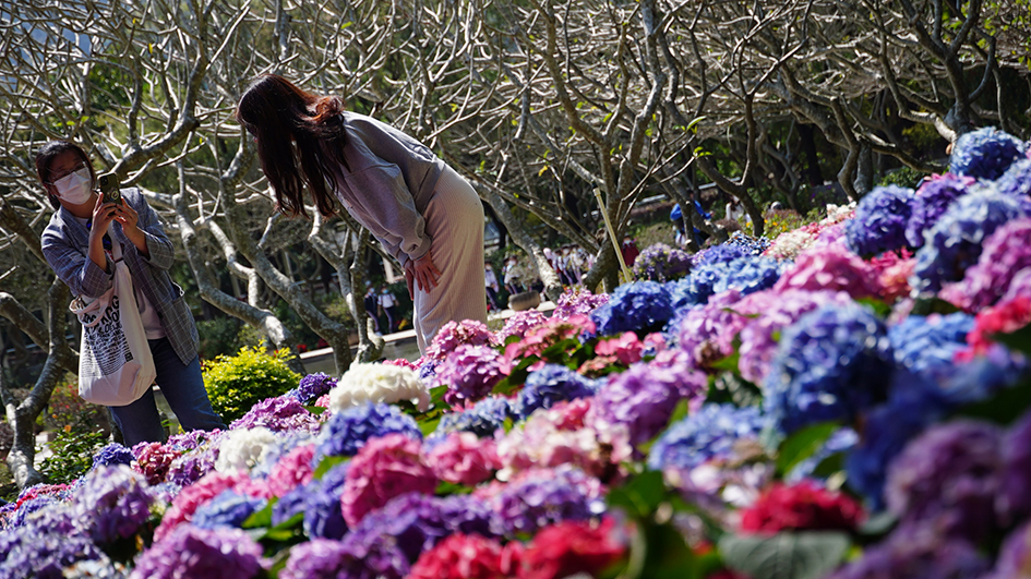春回大地之日,正是花朵爭妍鬥麗之時。大埔海濱公園近香港回歸紀念塔附近花圃栽種了色彩繽紛的繡球花,以香港回歸紀念塔為中心,呈扇形的花田除了繡球花外還栽種了金魚草、鼠尾草、油菜花等顏色燦爛的植物。因為季節限定所致,現時繡球花分外璀璨繽紛,吸引市民到來觀賞及留影。(記者 俊文/攝)