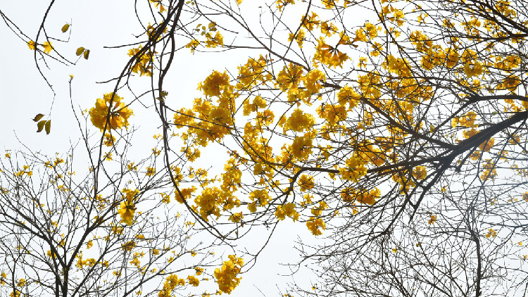 在陽光下的南昌公園,黃色風鈴木更顯耀眼。朵朵黃金花花形美麗又浪漫,吸引不少市民趁周末來打卡。南昌公園已成賞花秘境,趁僅得一兩周的最佳花期內捉緊黃金一刻。(記者 崔俊良攝)