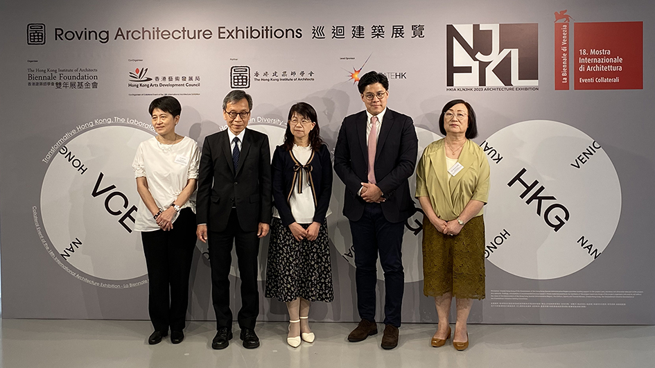 頂圖:(左起)香港建築師學會雙年展基金會主席劉文君、香港建築師學會會長陳澤斌、特區政府「創意香港」助理總監曹黎淑霞、香港藝術發展局主席霍啟剛、香港藝術發展局行政總裁周蕙心。