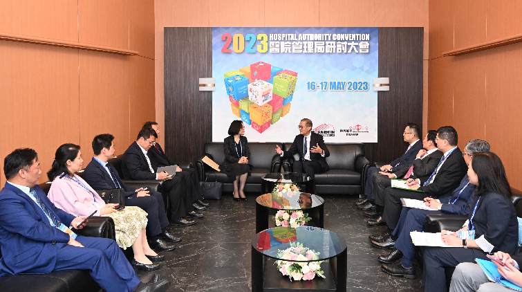 在昨日(16日)和今日的「2023醫院管理局研討大會」舉行期間,范鴻齡與高拔陞亦與廣東省衞健委主任朱宏帶領的代表團及參與「大灣區醫療人才交流計劃」的醫護人員會面,就加強兩地交流的事宜交換意見。另外,醫管局亦與上海市衞健委副主任虞濤帶領的代表團及上海申康醫院發展中心代表團成員會面,就兩地在公立醫院發展方面開展交流,共同探討加強滬港在提升醫院管理水平方面的合作。(圖源政府新聞處)