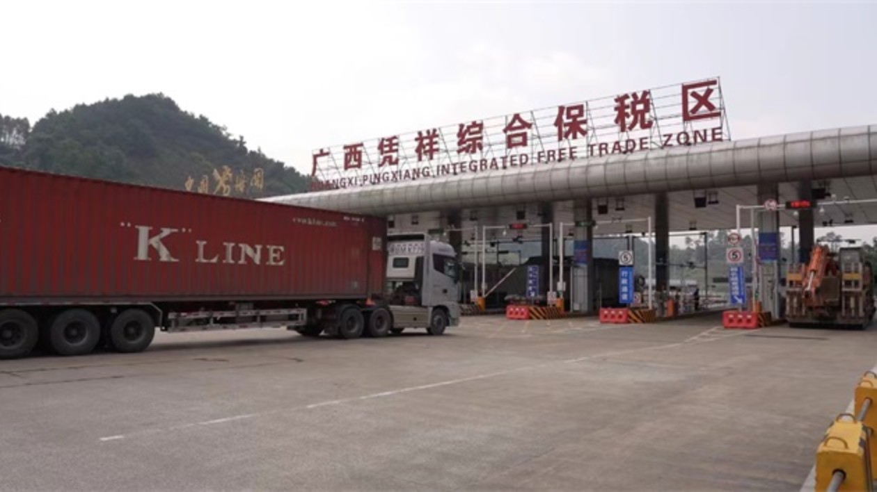 在憑祥綜合保稅區,滿載貨物的大卡車川流不息。來自東盟國家的榴槤、菠蘿蜜在這裏經過海關查驗,進入中國市場,而中國的農業機械、電子元件、日用百貨等貨品則從這裏走向世界。