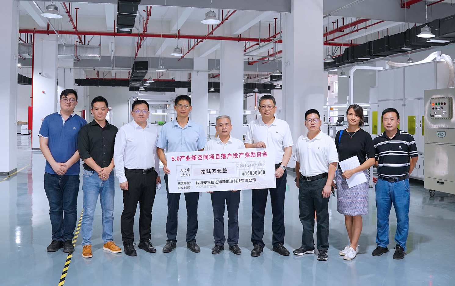5月31日,珠海高新區黨工委委員、區管委會副主任薛飛,市工業與信息化局、市招商署相關負責人組成的調研組一行首先來到位於港灣7號·智造超級工廠一期2棟的珠海安易控江海新能源科技有限公司(以下簡稱:安易控),將16萬元現金支票送到該企業負責人手上。安易控計劃在珠海打造中國首個船舶動力電池系統全體研發製造基地,目前該公司生產車間面積約為5400平方米。