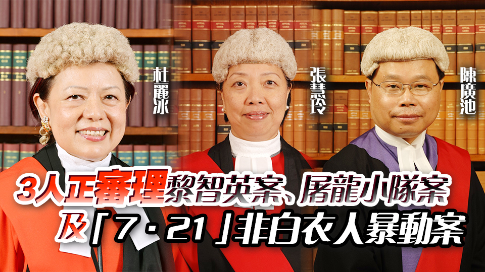 資料顯示,杜麗冰正審理黎智英涉串謀勾結外國勢力案,案件將於11月20日續審;張慧玲正在審理屠龍小隊涉設置炸彈案,陳廣池則在審理元朗「7·21」非白衣人暴動案。兩案仍未完結,屠龍小隊案將在11月14日判刑,「7·21」非白衣人案則將於12月12日裁決。