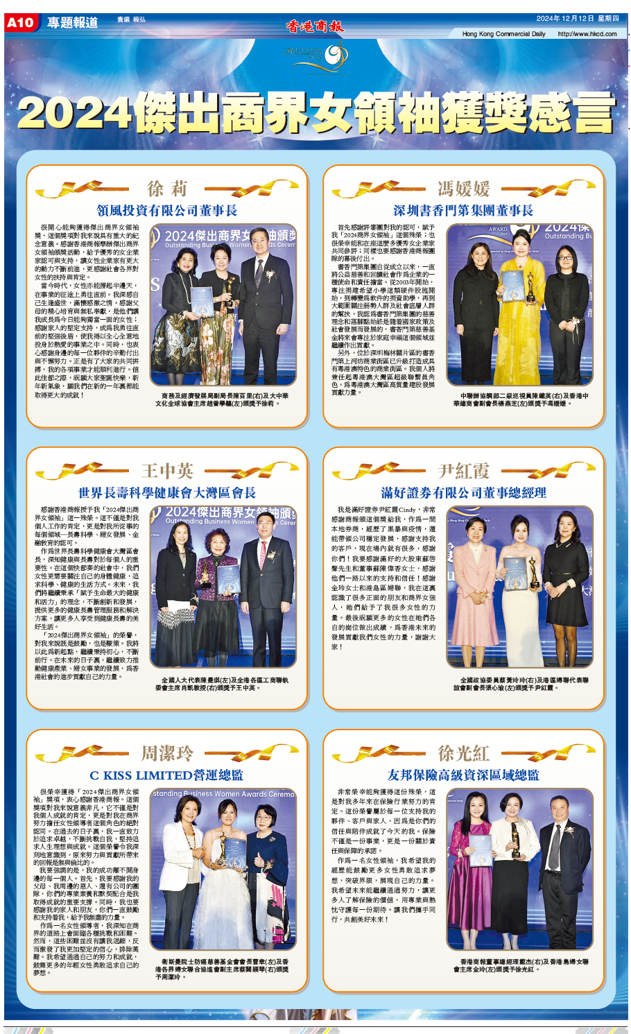 感謝香港商報授予我「2024傑出商界女領袖」這一殊榮。這不僅是對我個人工作的肯定,更是對我所從事的每個領域——長壽科學、婦女發展、金融教育的認可。