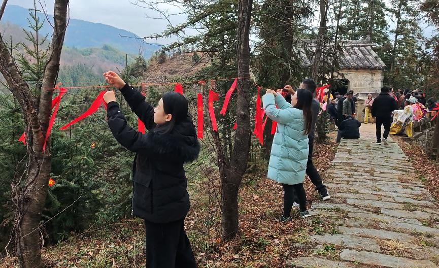 9時整,徒步活動正式開啟。大家從蘇氏宗祠廣場出發,沿必吉嶺古道向五福廟行進。沿途樹木上懸掛着千餘枚「福、祿、壽、喜、財」五種福字,參與者們興致勃勃地尋找並收集福字,在徒步健身的同時,沉浸式體驗「集福」樂趣。徒步終點,大家將提前書寫好新年心願的祈福帶,系掛在必吉嶺古道兩旁的枝頭,祈求新的一年平安順遂、福氣盈門。同時,集齊五福的參與者憑福字兌換了精心準備的「福氣禮包」,傳遞出濃濃的新年祝福。