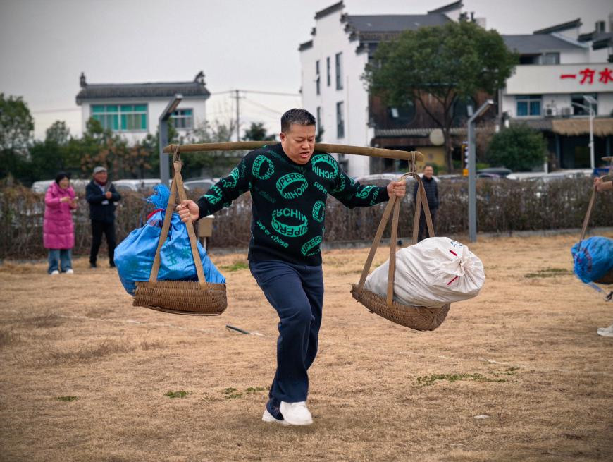 在安徽黃山徽州區的西溪南村,一場別開生面的農民趣味運動會在這裏熱鬧舉行。村民們與來自周邊城市的遊客攜手參與,在歡聲笑語中共迎新年。運動會現場,一場場融合農耕文化與體育競技的趣味比賽輪番上演。在獨輪車運糧、挑扁擔等項目中,村民與遊客同台競技,用傳統扁擔和獨輪車運輸糧食,既要比拼速度,又要考驗平衡與配合,讓不少城市遊客第一次親身體驗了鄉村樂趣。北京遊客劉子軒表示「這是我第一次來這個村子裡參加挑扁擔的活動,村民們都做得特別好,這的確是一場力量與技巧的競爭,在新的一年,我也希望我們能在自己的領域發光發熱,擼起袖子加油幹。」