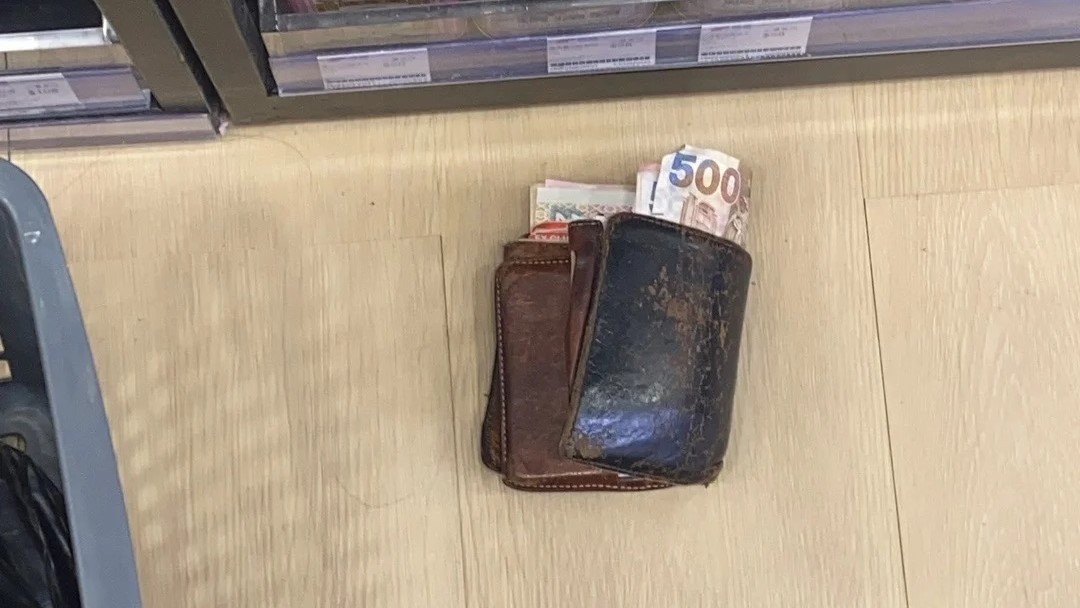 從樓主上載的相片可見,店舖地板上有一個頗為殘舊的皮質銀包,銀包並未完全合上、並有鈔票露出,而500元大鈔的銀碼更是清晰可見。