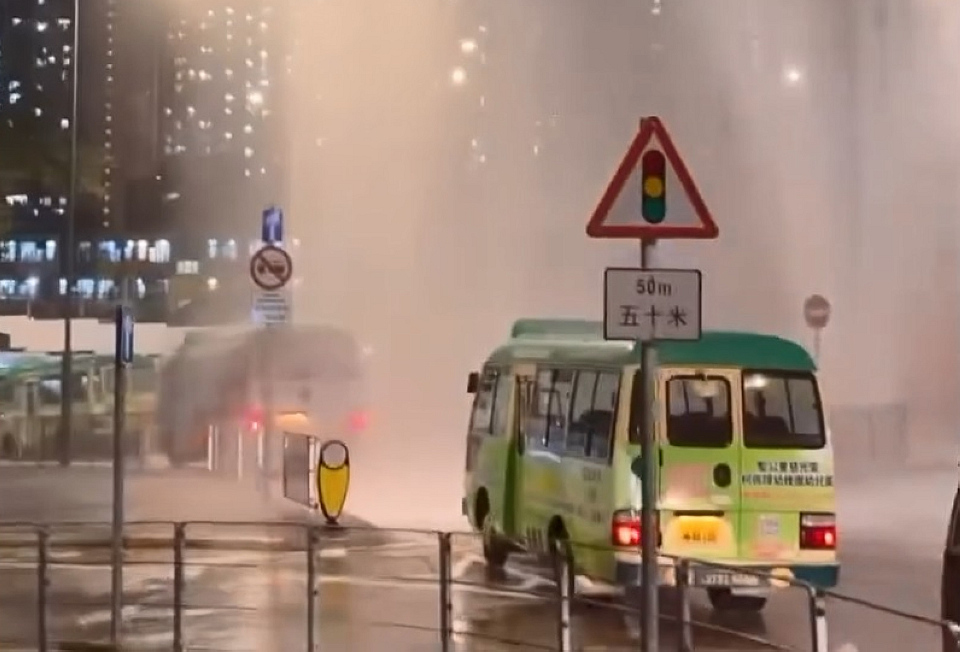 昨日(14日)晚上7時許,黃大仙沙田坳道近鳳德道及盈鳳里交界,地底有鹹水管爆裂,大量鹹水噴出路面,水柱近數層樓高,行經車輛彷如「淋雨」,有網民拍下爆水管時情況,留言說:「排隊洗車。」